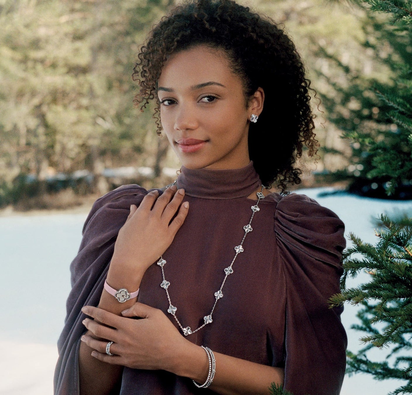 1968年に誕生以来、ヴァン クリーフ&アーペルの真のアイコンとなっているアルハンブラ コレクションに、この度、ギヨシェ ホワイトゴールドを纏った5点のジュエリーが加わり、一層の輝きを添えます。さらにこれらの新作を際立たせるように、ブレスレットにゴールドビーズが煌めくローズゴールドのウォッチも登場し、時を超えた美しいデザインで幸運を祝福します。