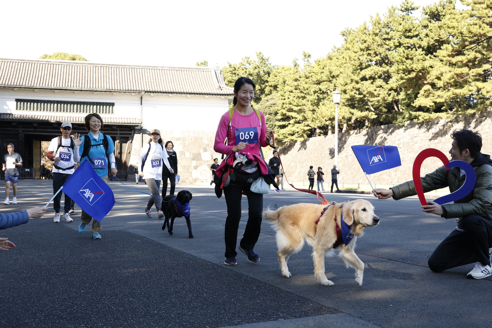 チャリティラン&ウォークには、小児がんを経験したシャイン・オン!メンバーの子どもたちをご招待いただき、また、ファシリティドッグ・アニー、候補犬オリ、ハンドラーの森田が参加させていただきました。アニーは、初めて皇居に来たオリをリードしながら、「行くわよ!」と意気揚々。秋晴れの心地よい空の下、アニーと森田、そしてオリが皇居外周を軽やかに1周(5キロ)走り切りました!皆さまとの楽しい時間に、アニーもオリも温かいエネルギーをいただきました。