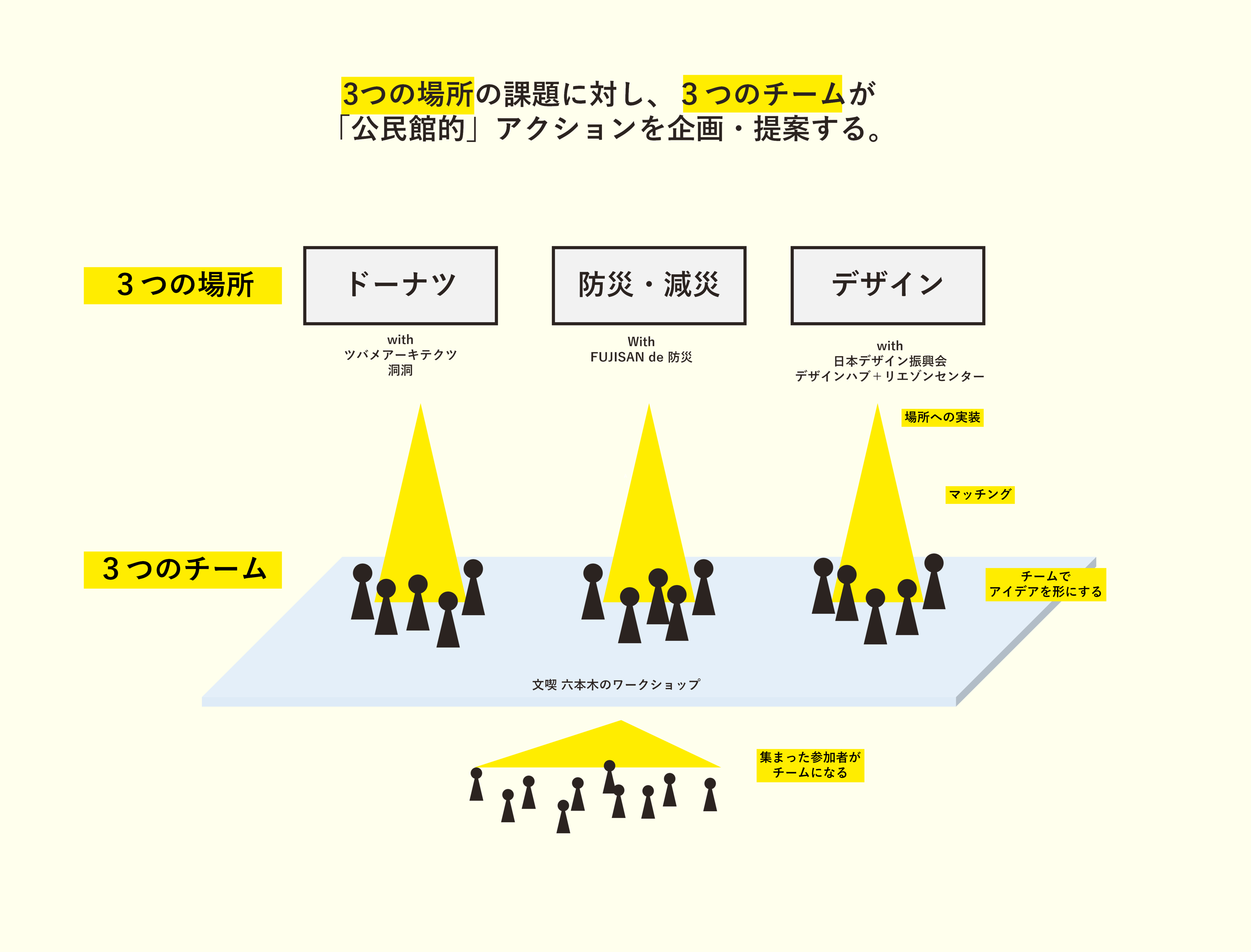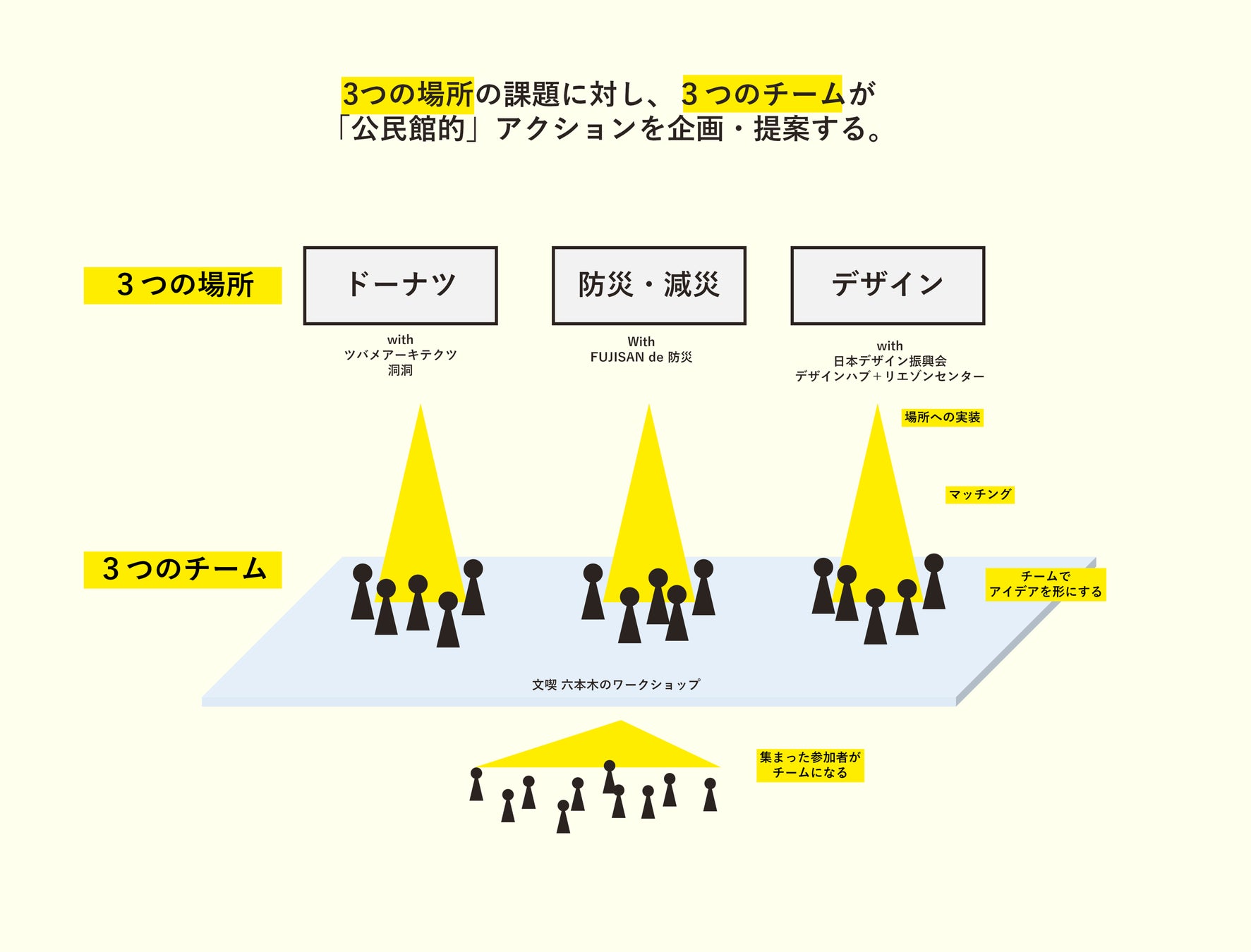 3つの場所は、それぞれに周辺環境や課題、関わる人など異なる性質を持っています。建築ユニット「ツバメアーキテクツ」の新オフィスの1階にオープンするドーナツショップ「洞洞」。自治体、自動車メーカー、保険会社のメンバーからなる防災プロジェクト「FUJISAN de 防災」。日本デザイン振興会が、六本木・東京ミッドタウン5階で運営するデザインネットワークの拠点「東京ミッドタウン・デザインハブ」と「リエゾンセンター」。それぞれの場で「ドーナツ」、「防災・減災」、「デザイン」というユニークなテーマで「公民館的」アクションの創出に取り組みます。