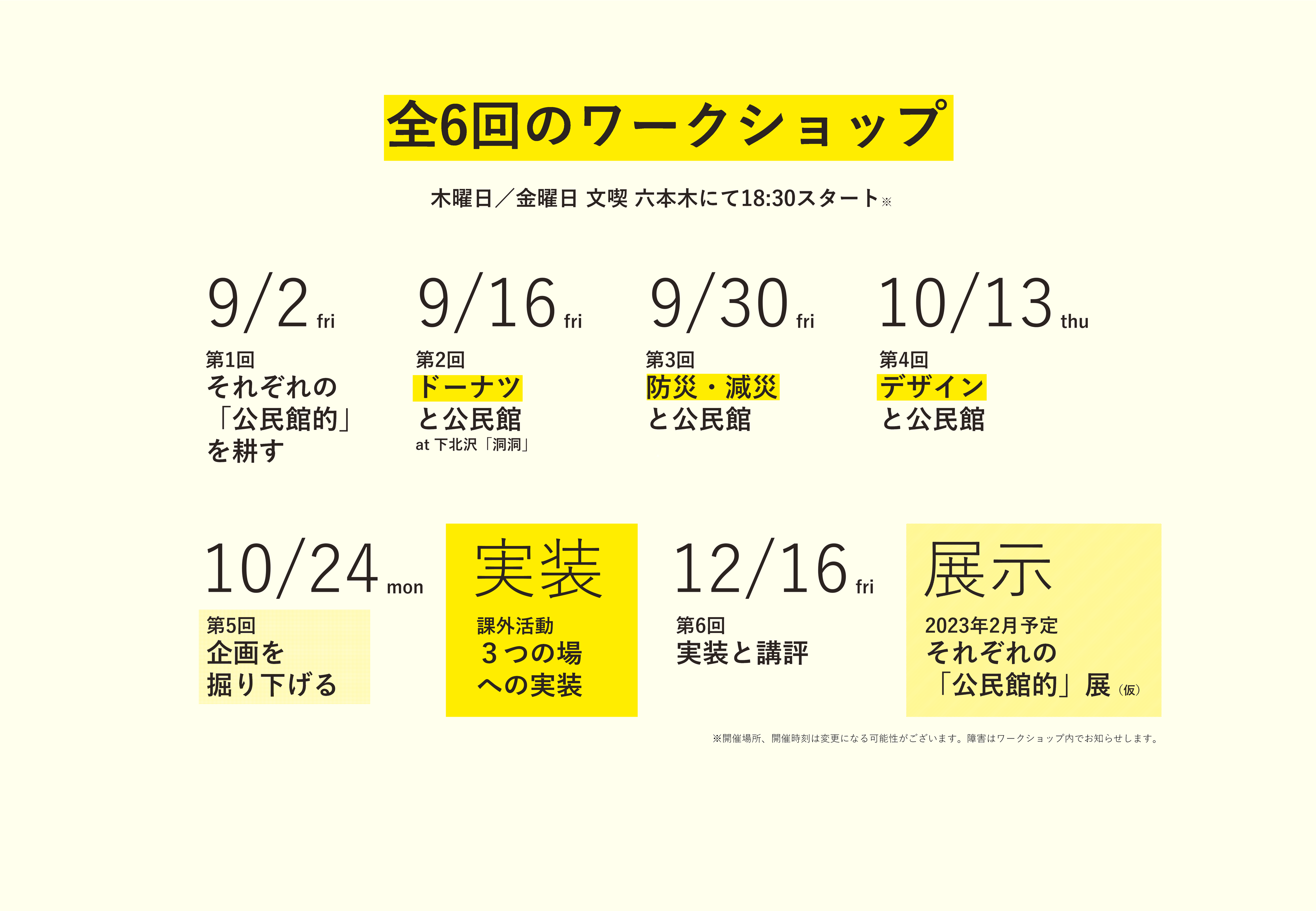 ワークショップは全6回を予定。3つの企業・プロジェクトの「場所」と連携し「3つの場所の課題」に対して、参加者がチームごとに取り組んでアイデアを出していきます。ワークショップ終了後は、「文喫 六本木」で「それぞれの「公民館的」展(仮)」を開催します。