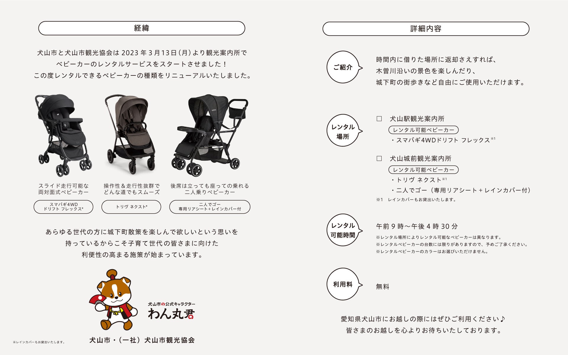 この度、レンタルできるベビーカーの種類をリニューアルし、犬山市を訪れた方がより市内観光を楽しめるような環境づくりをサポートしています。