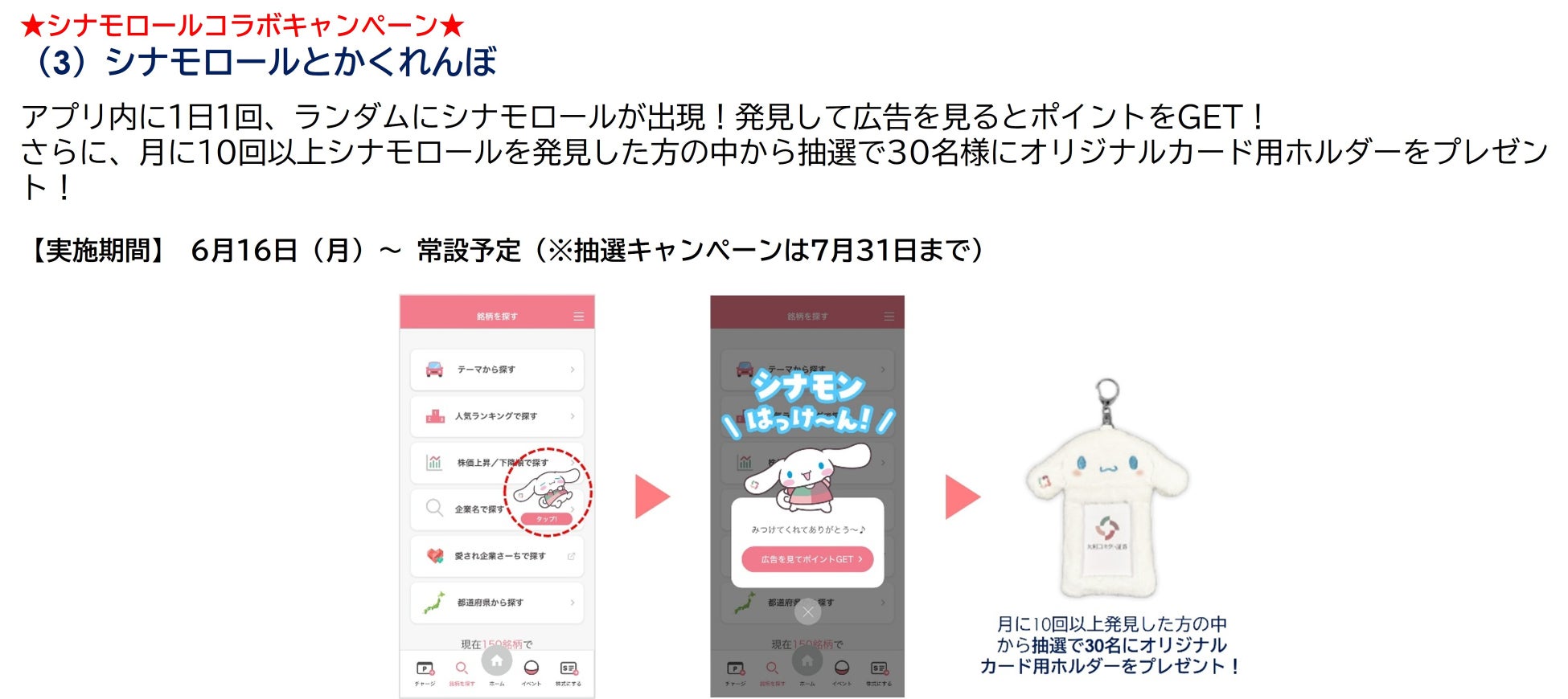 これを記念し、「5周年・5大コラボキャンペーン」を実施いたします。同日よりアプリには大和コネクト証券のイメージキャラクターである、株式会社サンリオの「シナモロール」が新キャラクターとして登場!