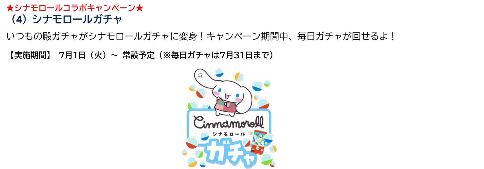 ① 選べる2,000円相当 + 抽選で「サンリオピューロランド デイパス ポート(大人1枚)」、オリジナルマスコットをプレゼント! ② 新キャラクター選択にシナモロールが登場! ③ シナモロールとかくれんぼ ④ シナモロールガチャ ⑤ ゲームで稼ごうポイントUPキャンペーン |