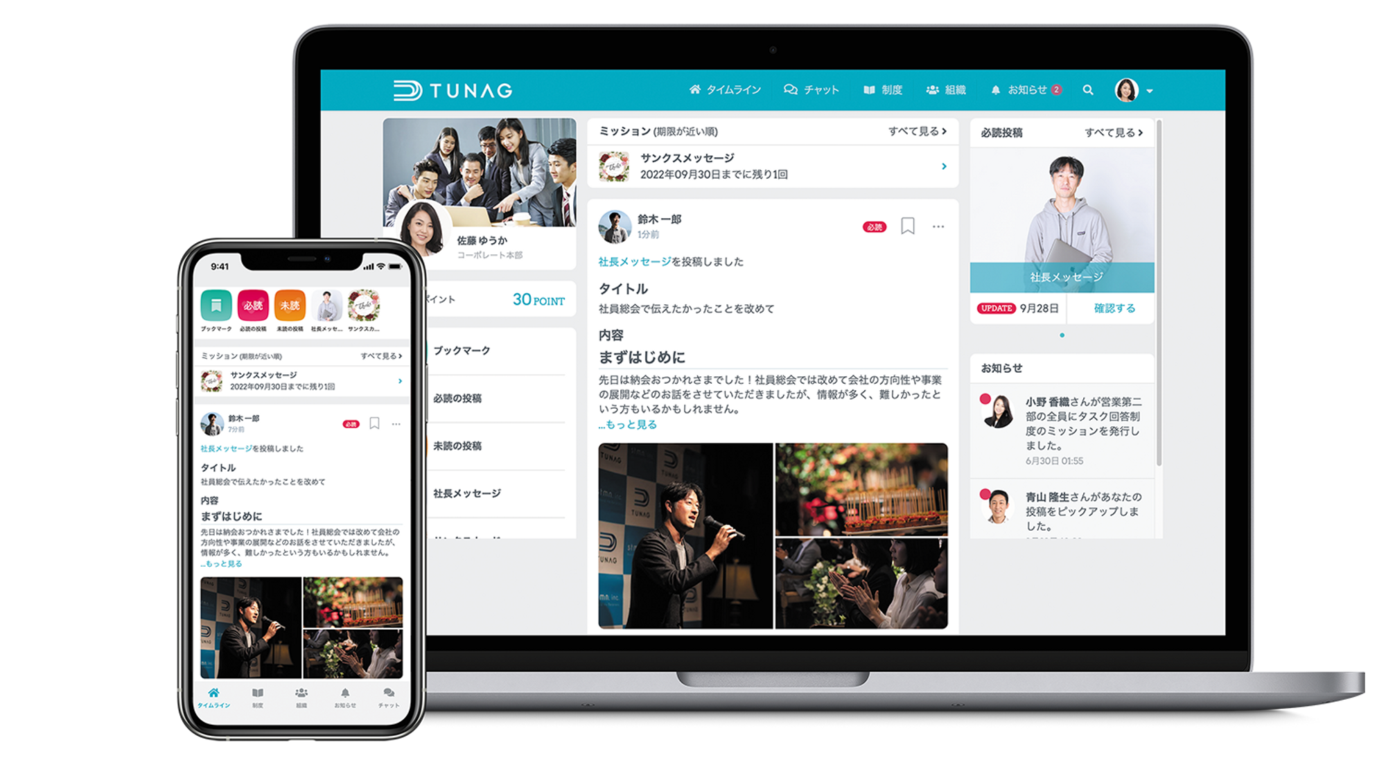 TUNAGについて「TUNAG」は、組織のエンゲージメント(=会社と従業員、従業員同士の相互信頼関係)向上を支援していくための機能をパッケージで幅広く提供するクラウド型プラットフォームサービスです。「社内制度」を軸としたコミュニケーションを設計することでエンゲージメントを高め、強い組織づくりを支援します。従業員数一万名超のグローバル企業から、十数人の企業や団体まで、規模や業種、業態を問わず様々な企業でご導入いただいております。