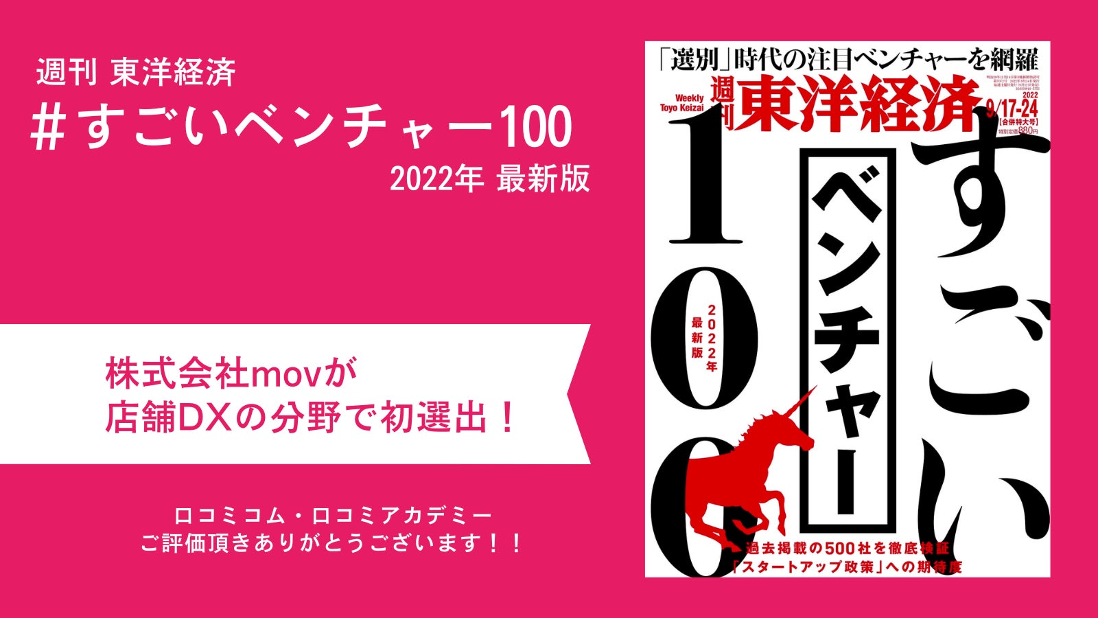 口コミサイトを”もっと”売上に変える、AI店舗支援SaaS「口コミコム」を運営する株式会社mov(代表取締役:渡邊 誠、本社:東京都渋谷区、以下mov)は、東洋経済新報社が毎年発表している「週刊東洋経済 すごいベンチャー100 2022年最新版」に選出されました。過去5年の同企画の中で、Googleマップ周辺領域(MEO関連)の店舗DXを推進する事業者としては初の選出となります。