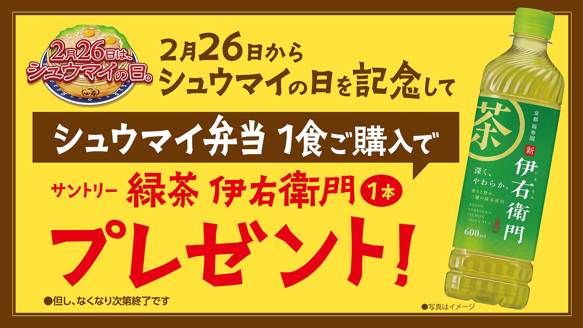 シュウマイの日を記念して、リニューアルした「サントリー 緑茶 伊右衛門」をシュウマイ弁当1食ご購入につき、1本プレゼント。なくなり次第終了なので、是非お早めにお買い求めください。