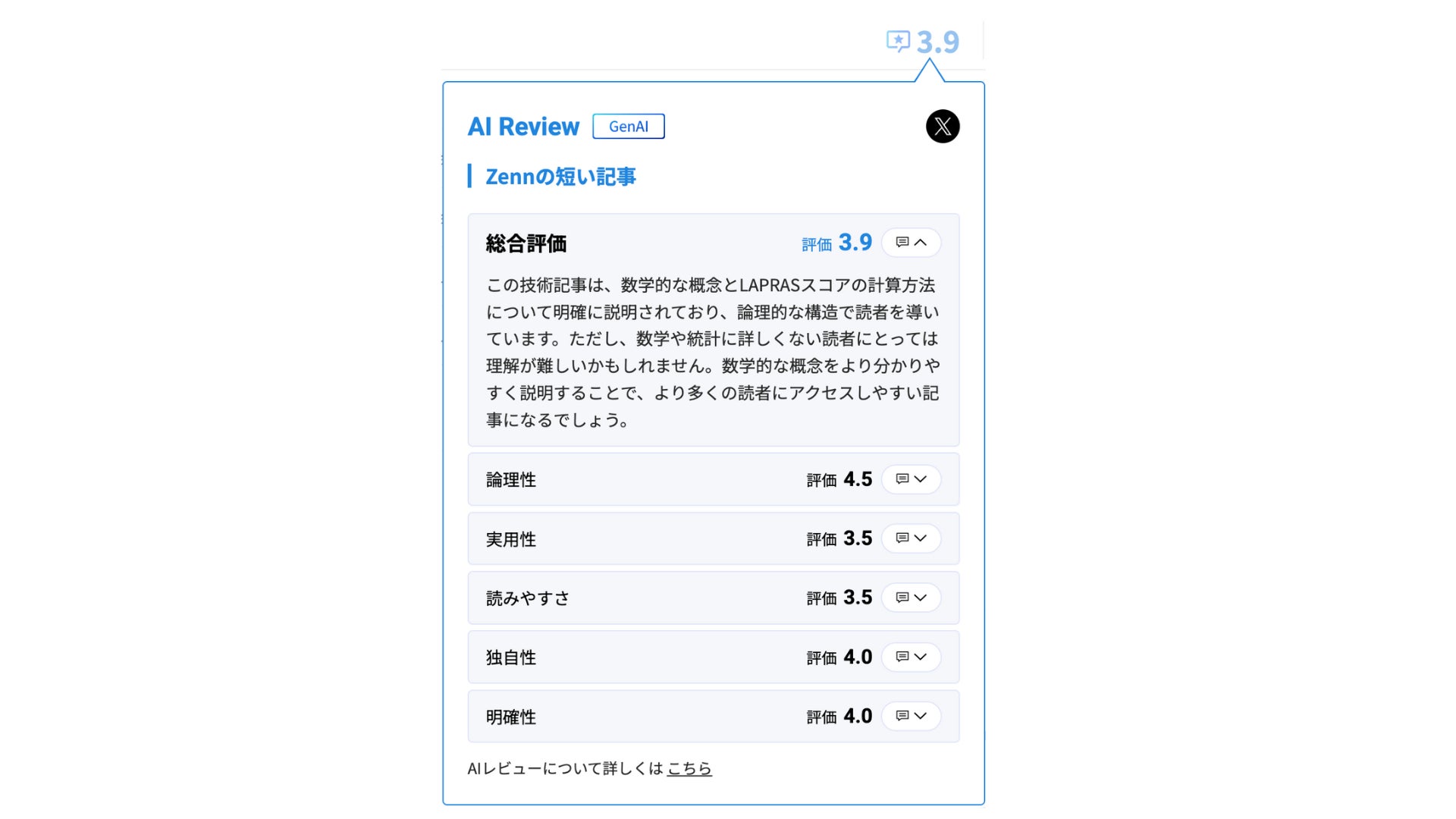 AIレビューでは、技術記事を以下の5つの観点から0.0〜5.0の範囲で評価し、その平均を総合点として計算しています。