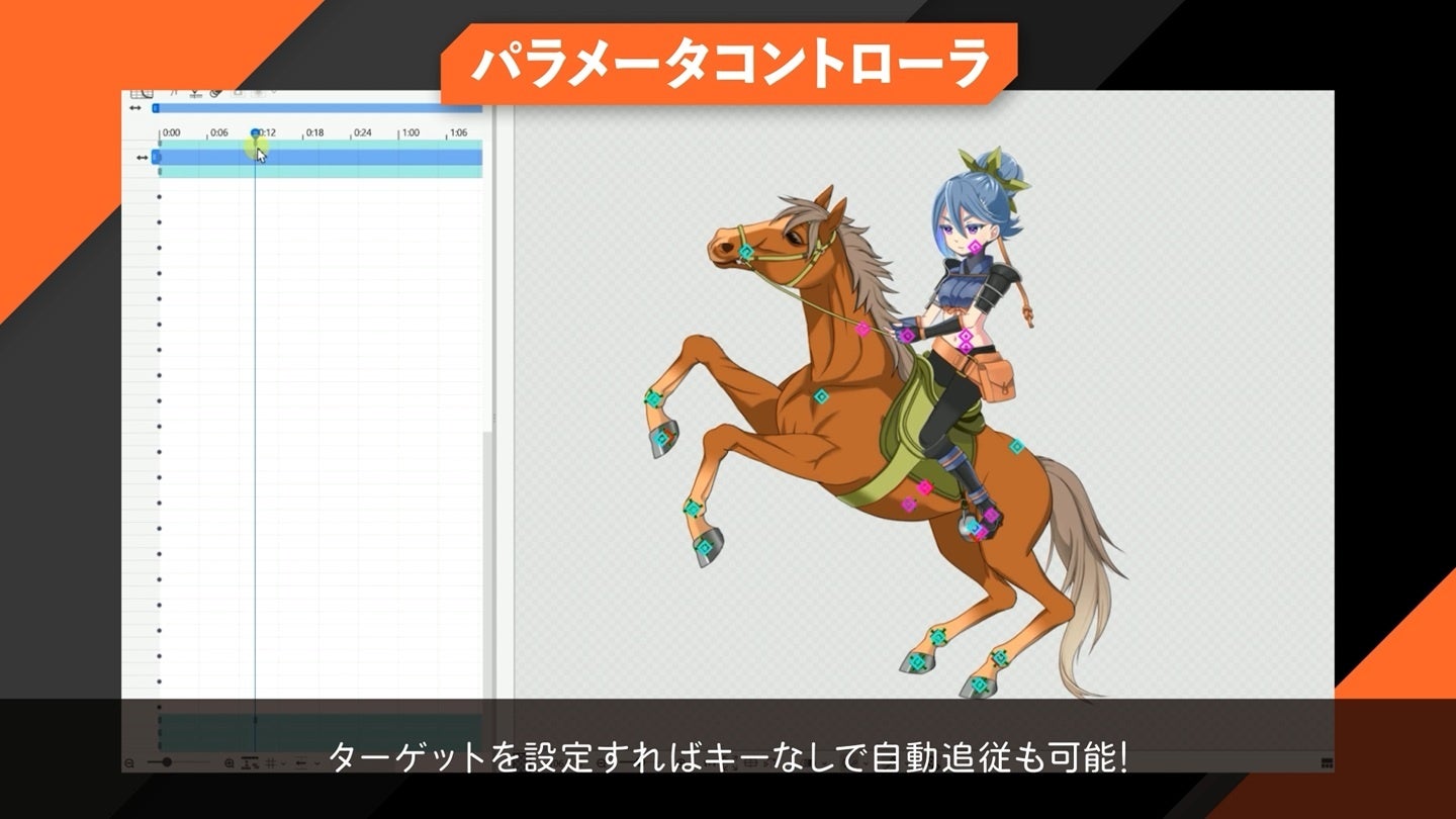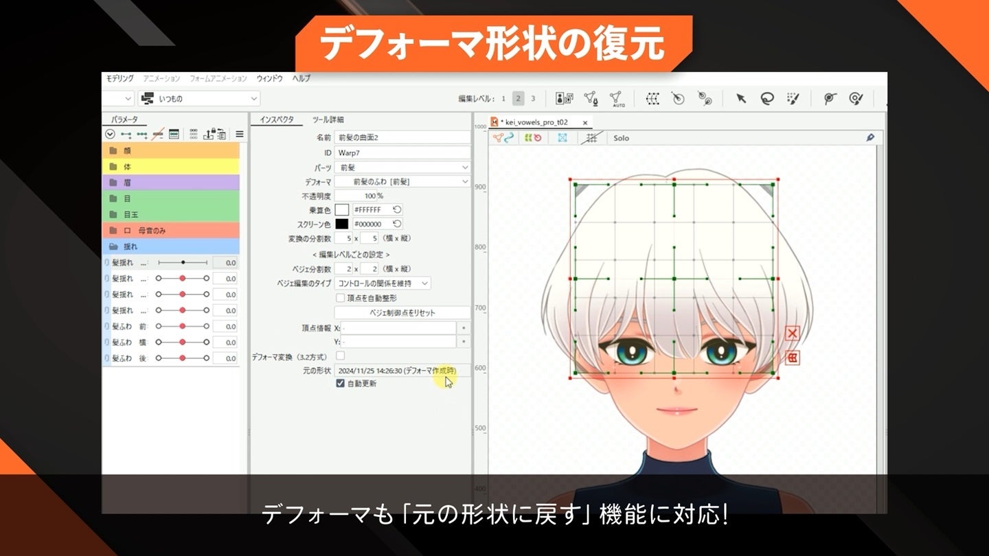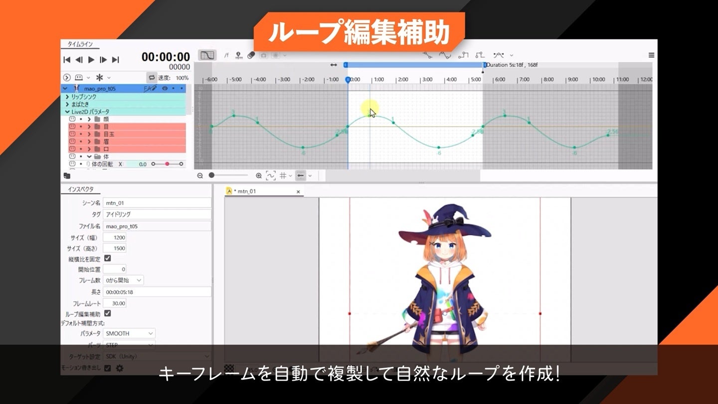 待望のIK操作可能なパラメータコントローラを搭載!ループ編集補助機能も加わり、これらの機能でCubism Editorでの従来のアニメーション制作時間を大幅に短縮することが可能になりました。また、反転した形状の貼り付けやデフォーマ形状の復元などモデル制作に役立つ機能を搭載しました。