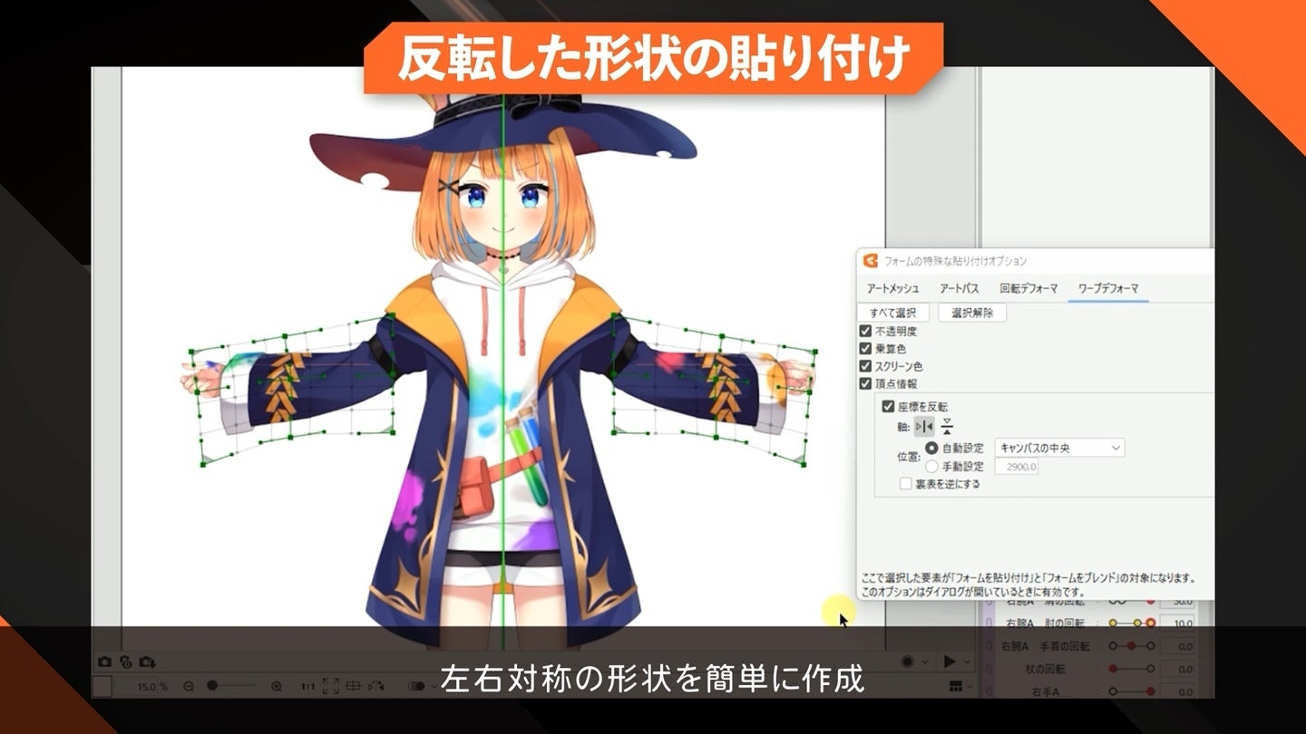 片側の形状をコピーして反対側に貼るだけで左右対称の形状を簡単に作成可能!