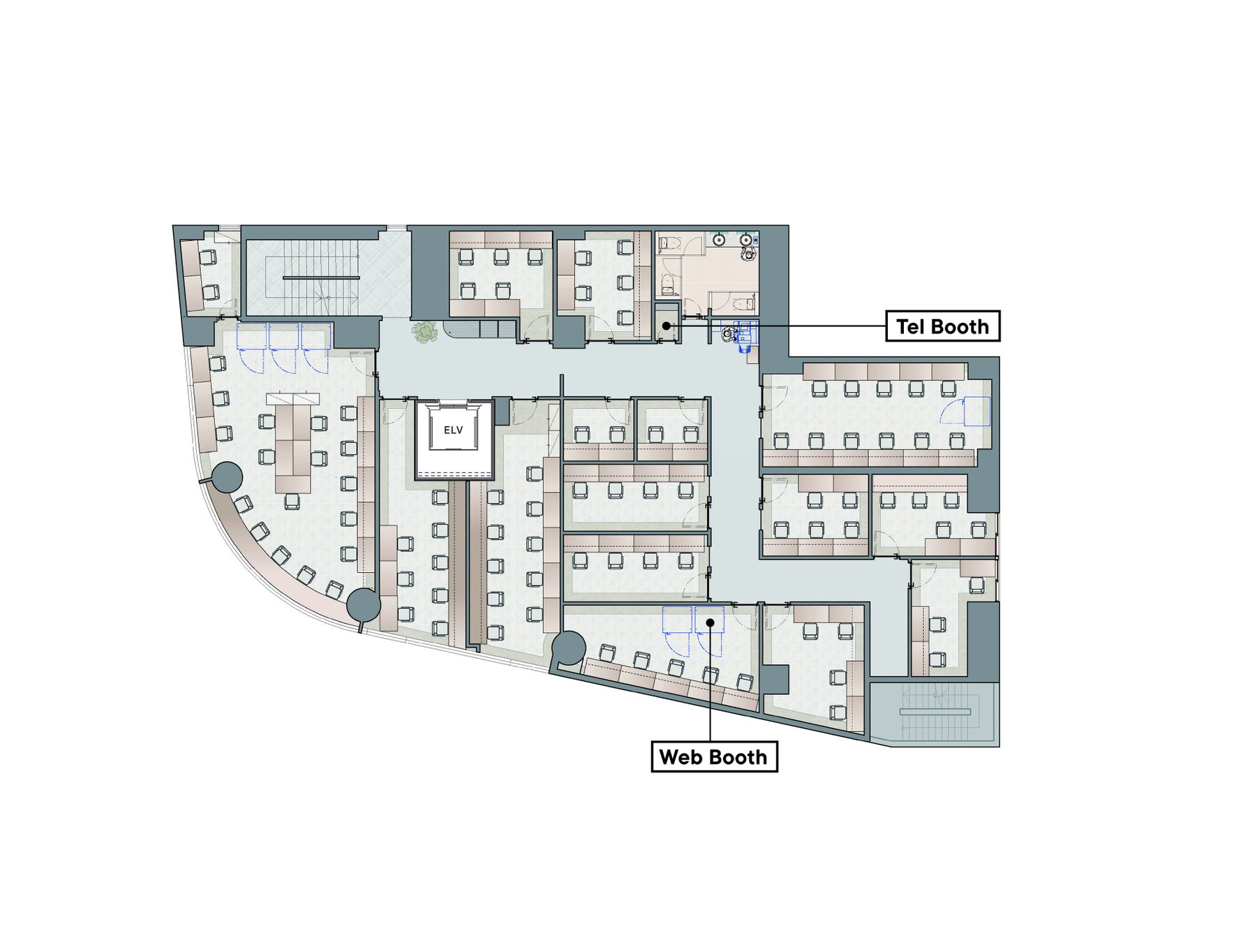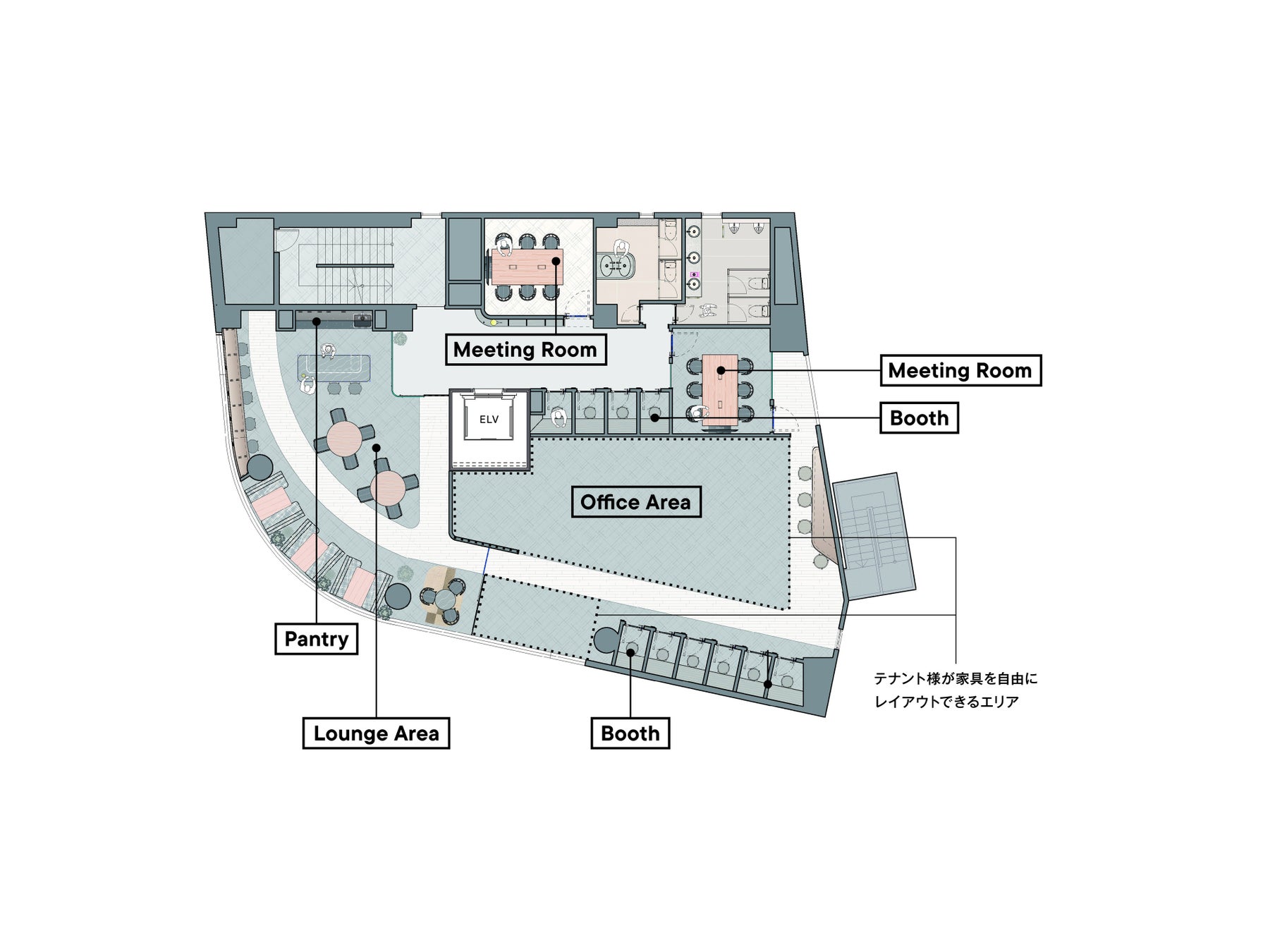 専用会議室や多数のWEBブース、専用パントリー等を備えた、フロアセキュリティ完備の1フロア1テナント専用オフィスプラン。セットアップ済みの専用ラウンジを備え、オフィスエリアについては自由にレイアウトが可能です。