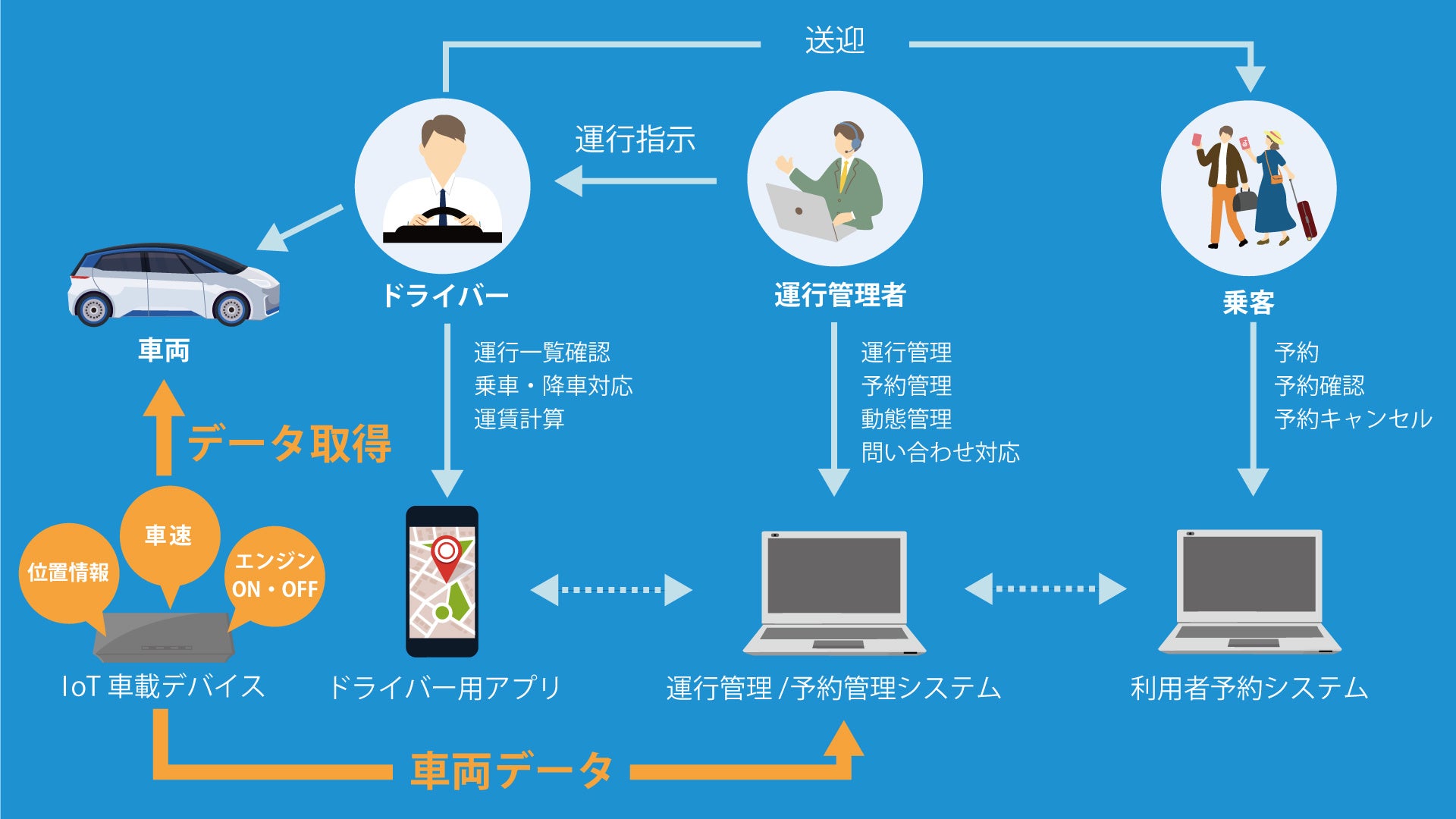 利用者予約システム、運行管理/予約管理システム、ドライバー用アプリ、IoT車載デバイスなどライドシェアの運営に必要な機能を一括で提供。運行管理者、ドライバーならびに乗客の利便性に配慮した設計となっています。