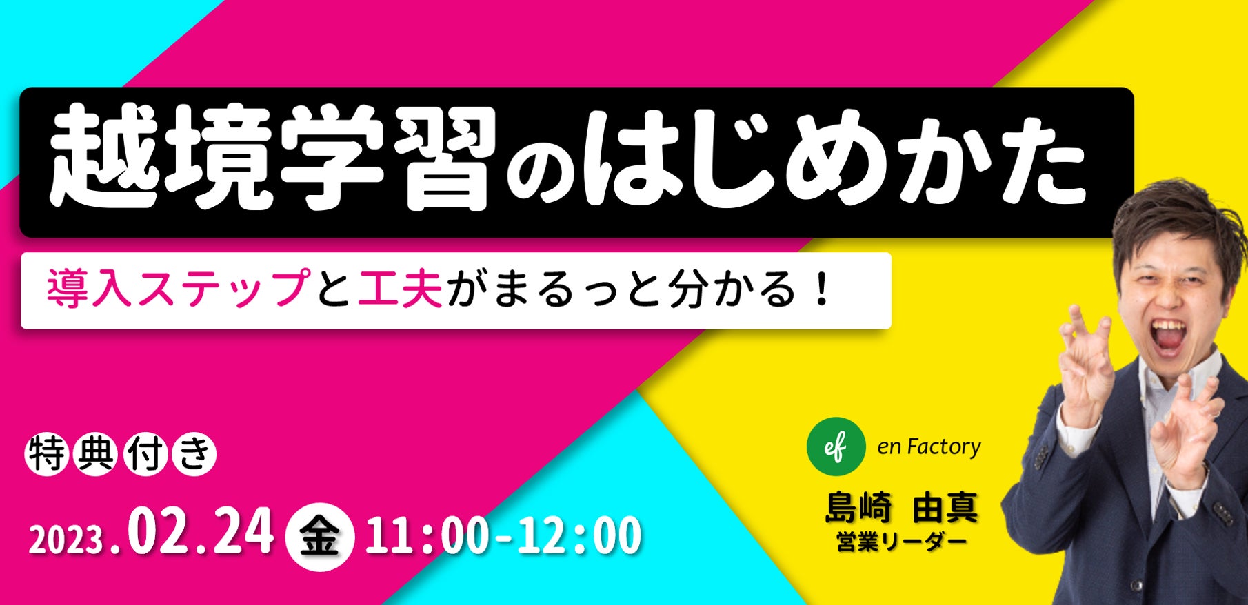 株式会社エンファクトリー(東京都渋谷区、代表取締役社長CEO加藤健太、以下、弊社)は、2023年02月24日(金)11:00-12:00より、「まるっと分かる!越境学習のはじめかた~導入ステップと工夫~【フォーマット&ガイドブック特典付き!】」ウェビナーを開催します。 (URL:https://teamlancer-20230224.peatix.com/)
