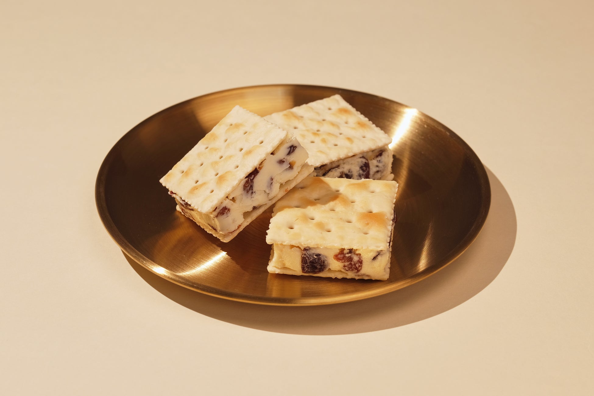 ラムの個性をしっかり利かせたレーズン、クリームチーズ、バターを混ぜた自家製のラムレーズンバターサンドです。クラッカーには少し塩味のあるものを使用し、バターの風味を引き立たせています。リッチな味わいのバターサンドは、苦味と甘みを引き立て合うコーヒーを使ったドリンクとのペアリングがおすすめです。