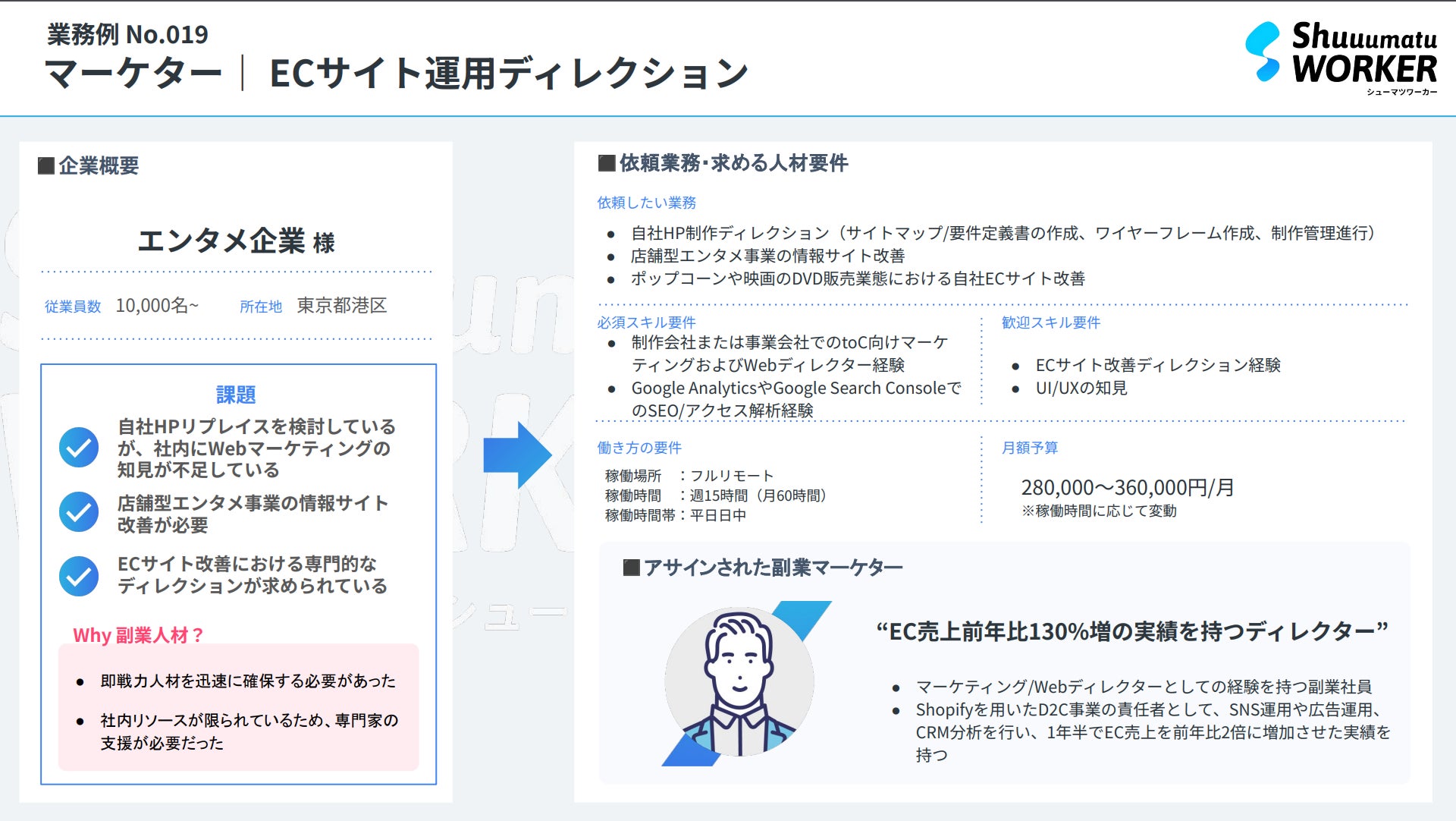 そこで今回、より多くの企業様に具体的なイメージをお持ちいただき、副業という新しい“働き方”に挑戦していただければ幸いです。