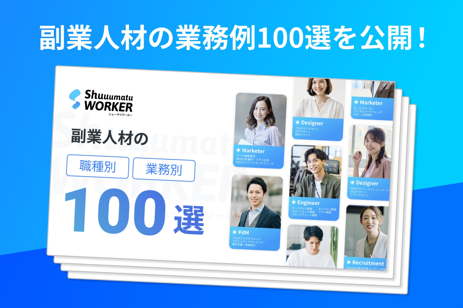 累計1万件の取り扱い事例の中で、シューマツワーカー担当者が選ぶ、代表的な副業人材の活躍例、企業による副業人材の活用事例を100例採り上げた、「副業人材の業務例100選」を公開中です。まだ副業人材を活用したことがない企業にとっても参考になる、具体的な成功事例集を、ぜひお役立てください!