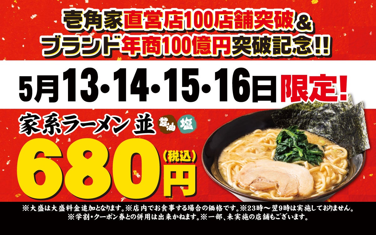 これらを記念して、2024年5月13日(月)~5月16日(木)の4日間限定で、家系ラーメン並を税込680円で販売します。ぜひ、お近くの壱角家へご来店ください。