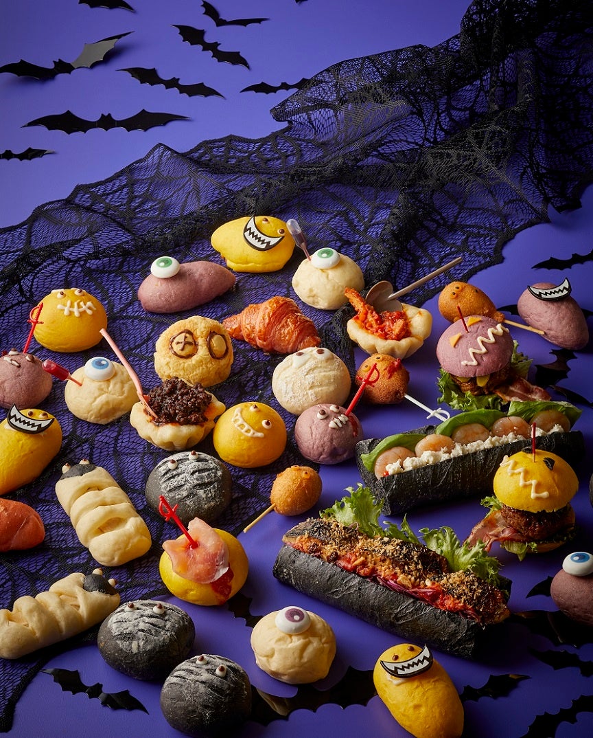 ただ可愛い、美味しそうだけではなく、パッと興味を惹くような「サムネ映え」も必至。そこで、毎回好評をいただいているシェフとブーランジェのコラボメニューをはじめ、20種類以上のホテルブレッドをハロウィーン仕様で登場します。ちょっぴり不気味でキュートなモンスターパンは、味はもちろんSNSに映える見た目や色、形にもこだわりました。黄色や赤色、黒色のパンは、かぼちゃやビーツ、竹炭で色付けし、どなたでも安心してお召し上がりいただけます。