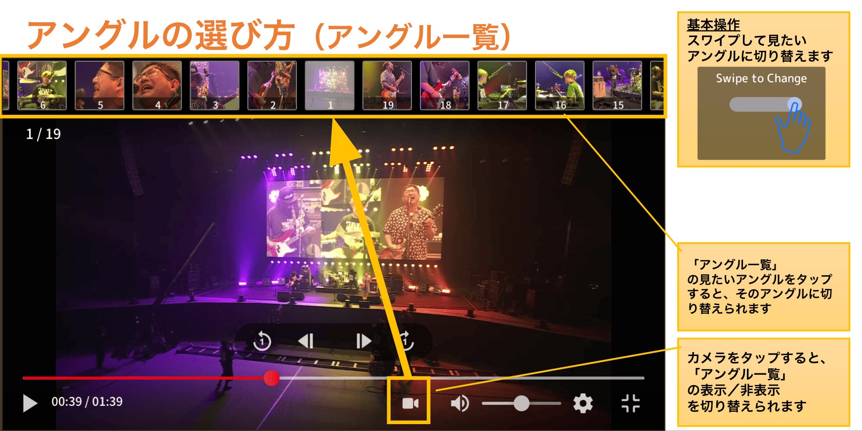 「SwipeVideo(スワイプビデオ)は、複数のカメラで撮影された映像を一つの映像視聴プレイヤーで構成し(下記画像参照)、視聴者は、そのプレイヤー内のアングルを、好きなタイミングで、好きなカメラアングルに切り替えて視聴できる最先端の映像配信技術(国際特許技術)です。視聴者は、音楽ライブやミュージカルなど、好きなメンバーや印象的なシーンに合わせて、アングルを切り替えたり、スポーツの試合では、得点シーンや奇跡の瞬間を巻き戻して、様々なアングルから見返し視聴することが可能です(生配信中でも巻き戻し、見返す事が可能です)。そして、SwipeVideoの大きな特徴は、視聴者に寄り添ったUXです。従来、他社で提供されてきたマルチアングル映像は、アングル切り替え時に、数秒程度、映像を読み込むための待ち時間(バッファリング)が発生したり、アングルを7アングル以上に増やすと低画質になってしまうという仕組みでしたが、SwipeVideoは、スムーズなアングル切り替えを可能とするため待ち時間なく(ノーバッファリング)、ストレスのない視聴体験の提供でき、かつアングル数を無制限に増やしても画質は低下しないという配信を実現しております。」