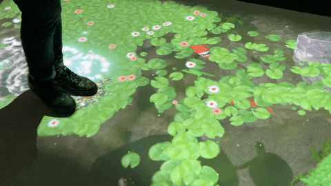 本日スタートした夏バージョンでは、透明感ある池の上を歩くと水が跳ねたり、鯉やカメなどのいきものに触れると逃げ出したりと、まるで水上散歩をしているかのような体験が楽しめます。