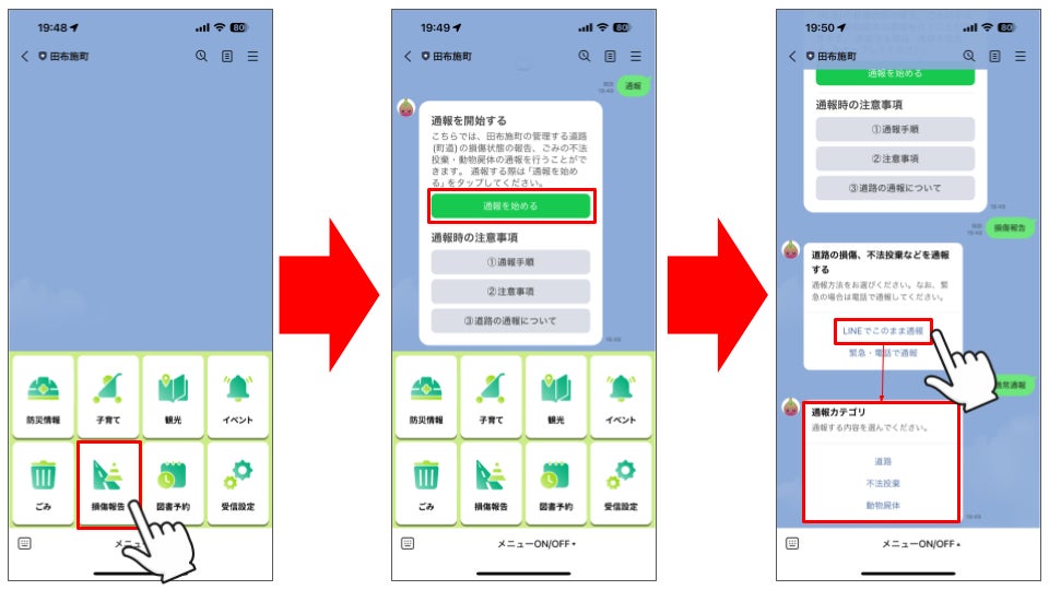 「損傷報告」では、町道の損傷やごみの不法投棄、倒木などを町に通報することができます。