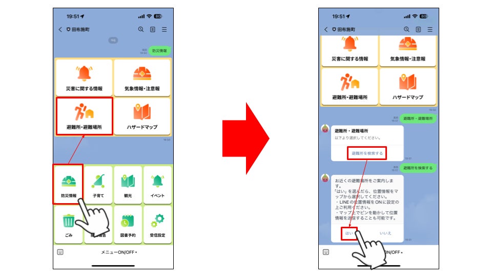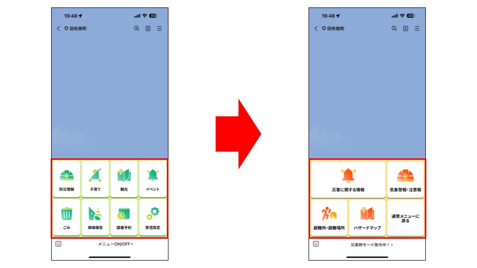 災害時の情報収集や避難所検索などの機能を提供します。災害の危険が迫っている場合などにリッチメニューが災害時モードに切り替わります。