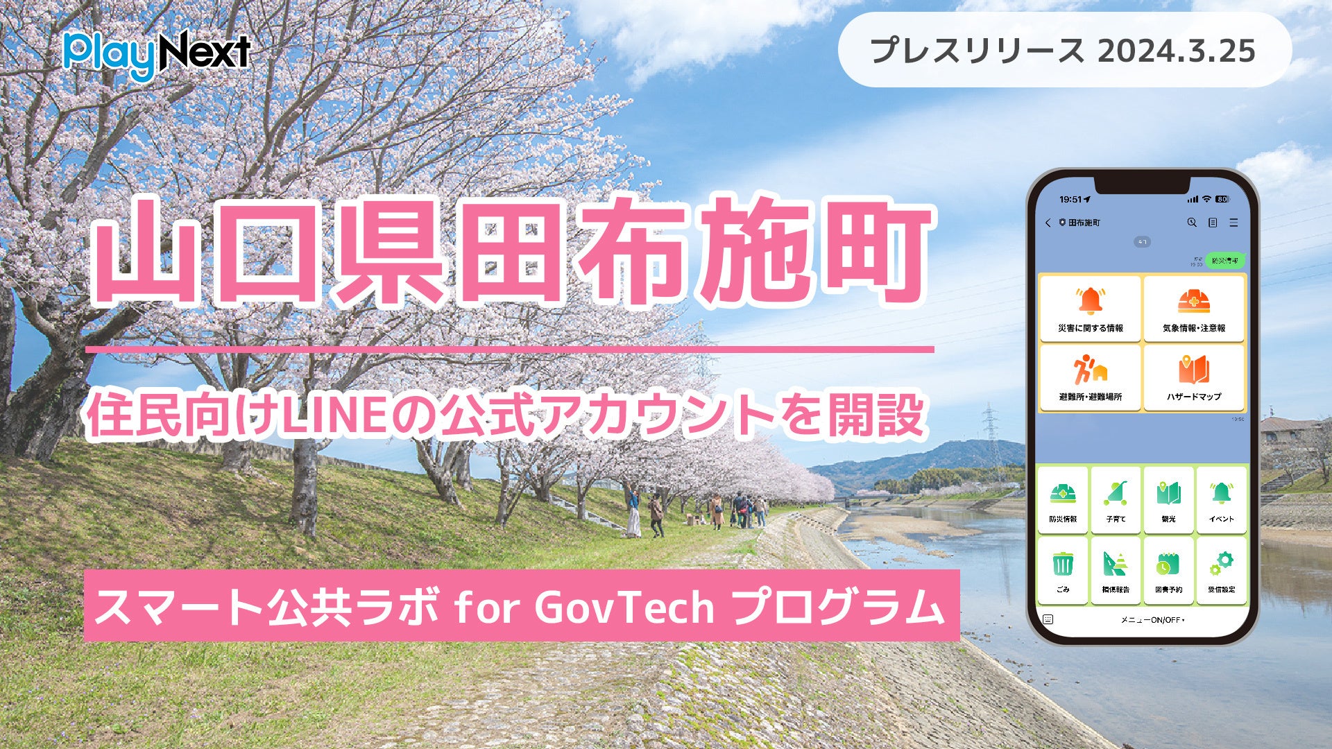 プレイネクストラボ株式会社(本社:東京都品川区、代表取締役:柏 匠、以下 「プレイネクストラボ」)は、合同会社DMM.com(本社:東京都港区、会長 兼 CEO:亀山敬司、以下「DMM」 )との協力により、山口県田布施町(以下「田布施町」)のLINE公式アカウントを「スマート公共ラボ with LINE GovTechプログラム」を活用して新規開設し、2024年3月25日(月)より運用を開始することをお知らせします。