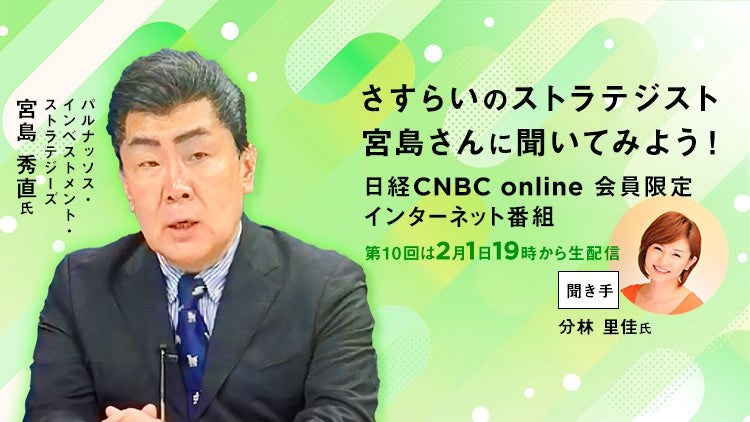 2⽉1⽇(木)は19時から⽇経CNBC onlineの会員に向けて、1月29日(月)14時に放送する「昼エクスプレス『さすらいのストラテジスト 宮島が斬る!』」では語り切れなかったことをじっくり解説するほか、会員のみなさんから寄せられた質問に時間が許す限りお答えします。