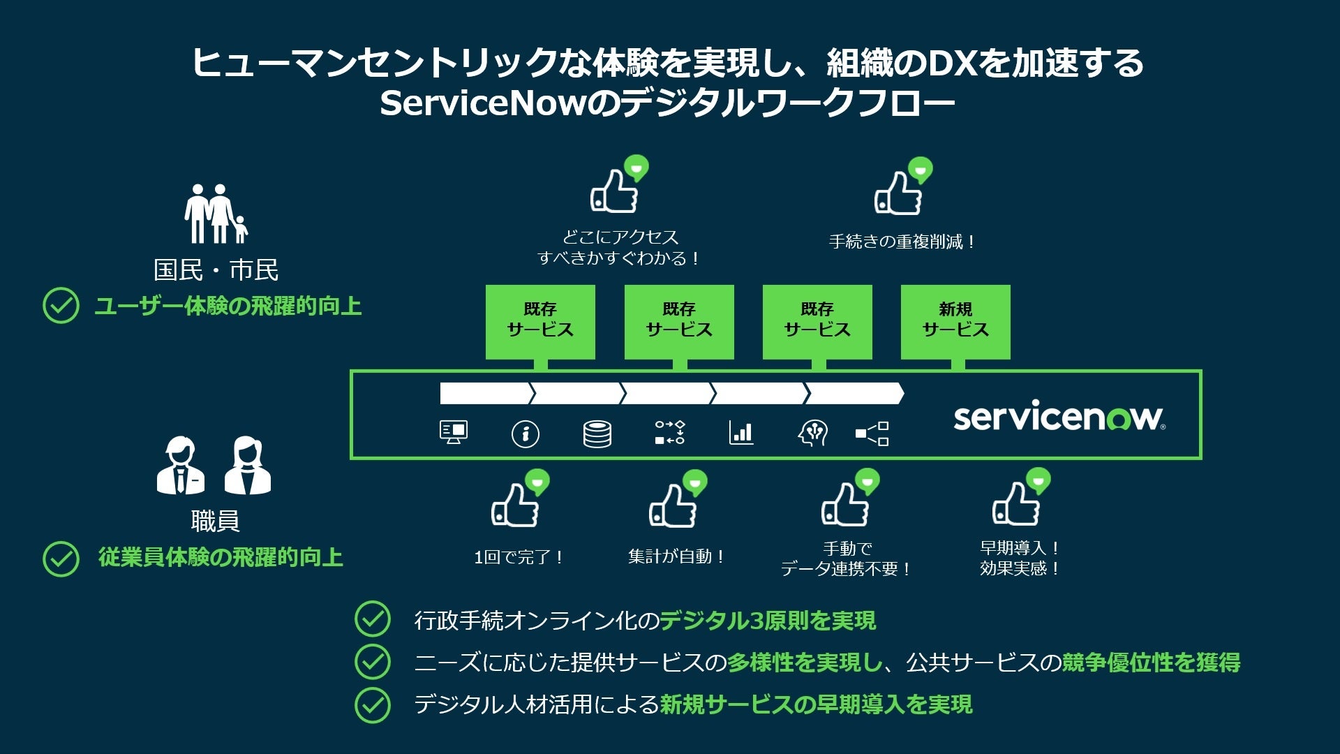 なお、ServiceNowのインテリジェントプラットフォーム「Now Platform( https://www.servicenow.com/jp/now-platform.html )」は、業界を問わず、あらゆる規模の企業が優れた顧客体験や従業員体験を実現するために国内外の企業や組織・団体により広く採用されています。昨今では、デジタル庁が掲げる「デジタルファースト、ワンスオンリー、コネクテッド・ワンストップ」を実現する信頼性の高いソリューションとして政府機関のみならず、自治体や、その関連する各種団体のデジタル化を支援するプラットフォームとして導入が進んでいます。市民が国や自治体が提供するサービスを利用するための体験を向上するだけではなく、各省庁や自治体の職員の業務効率化を図るといったデジタル化による価値を実現するデジタルワークフローを提供します。