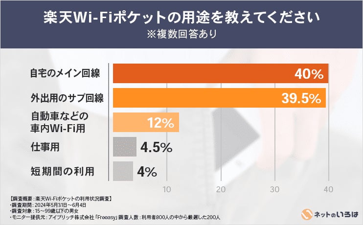 楽天Wi-Fiポケットの用途で最も多かったのは「自宅のメイン回線」で全体の40%でした。モバイルルーターを自宅回線として利用する方は意外にも多く、この結果から固定回線としても利用できる可能性があることが分かります。次いで「外出用のサブ回線」として利用する方が全体の39.5%、3位は「車内Wi-Fi用」で12%という結果になりました。