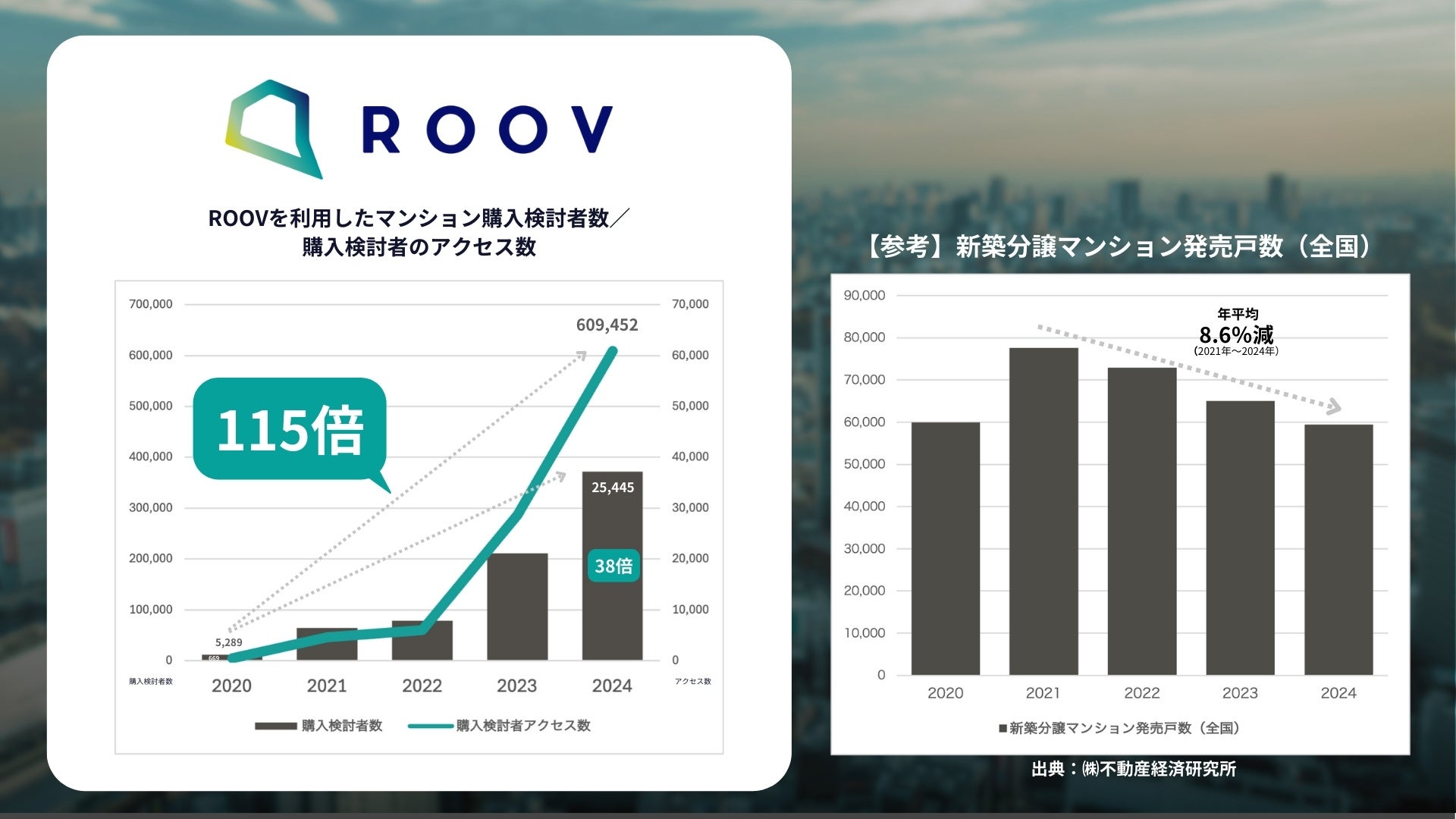 新築分譲マンション販売ソリューション「ROOV」を利用したマンションの購入検討者が、2024年とコロナ禍の2020年を比較すると38倍(669人→25,445人)に増加、同アクセス数は115倍(5,289→609,452)に急増しています。
