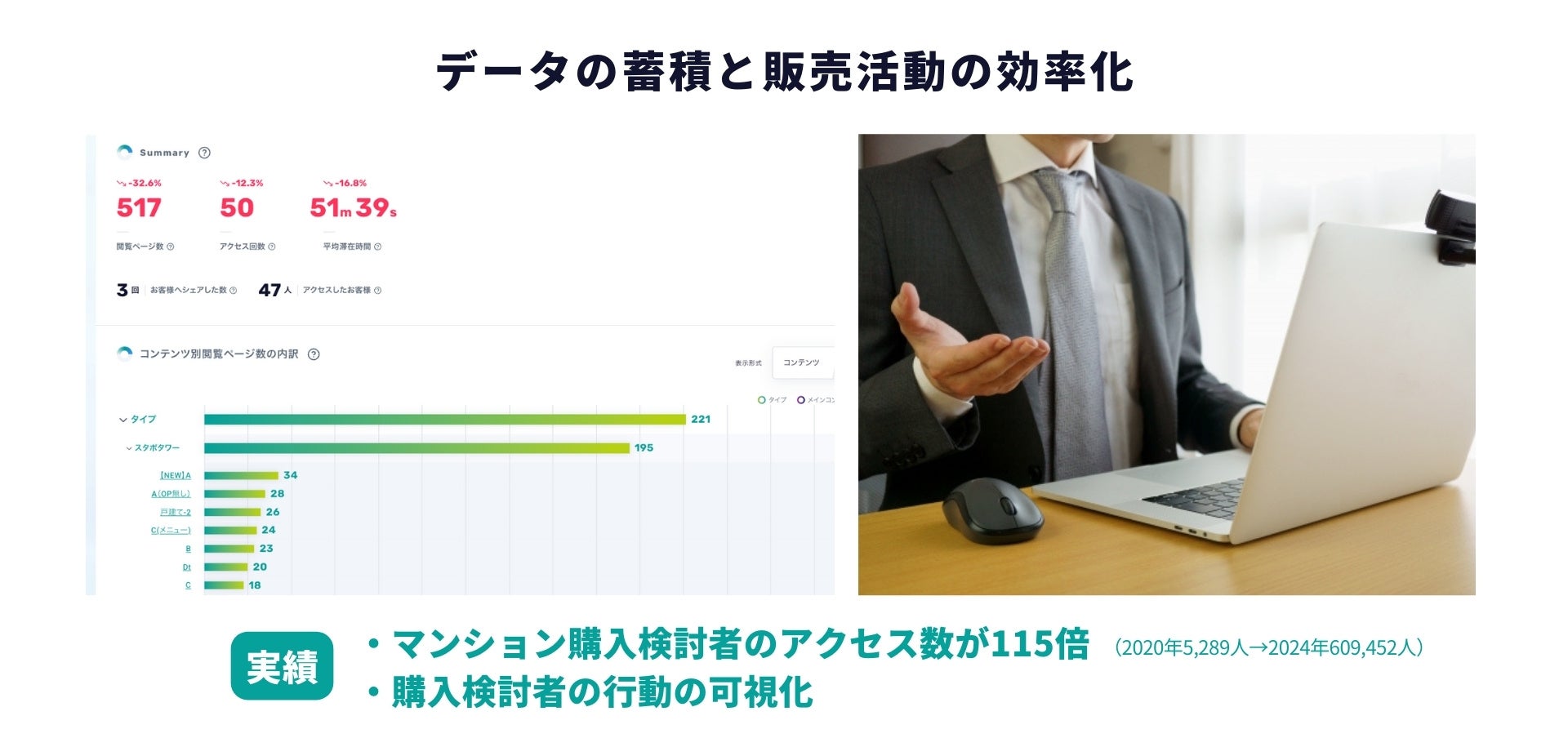 販売資料のデジタル化により、資料の準備・差し替え・配布の手間を軽減。さらに、顧客の行動解析データを活用した、より精度の高いマーケティングが可能に。
