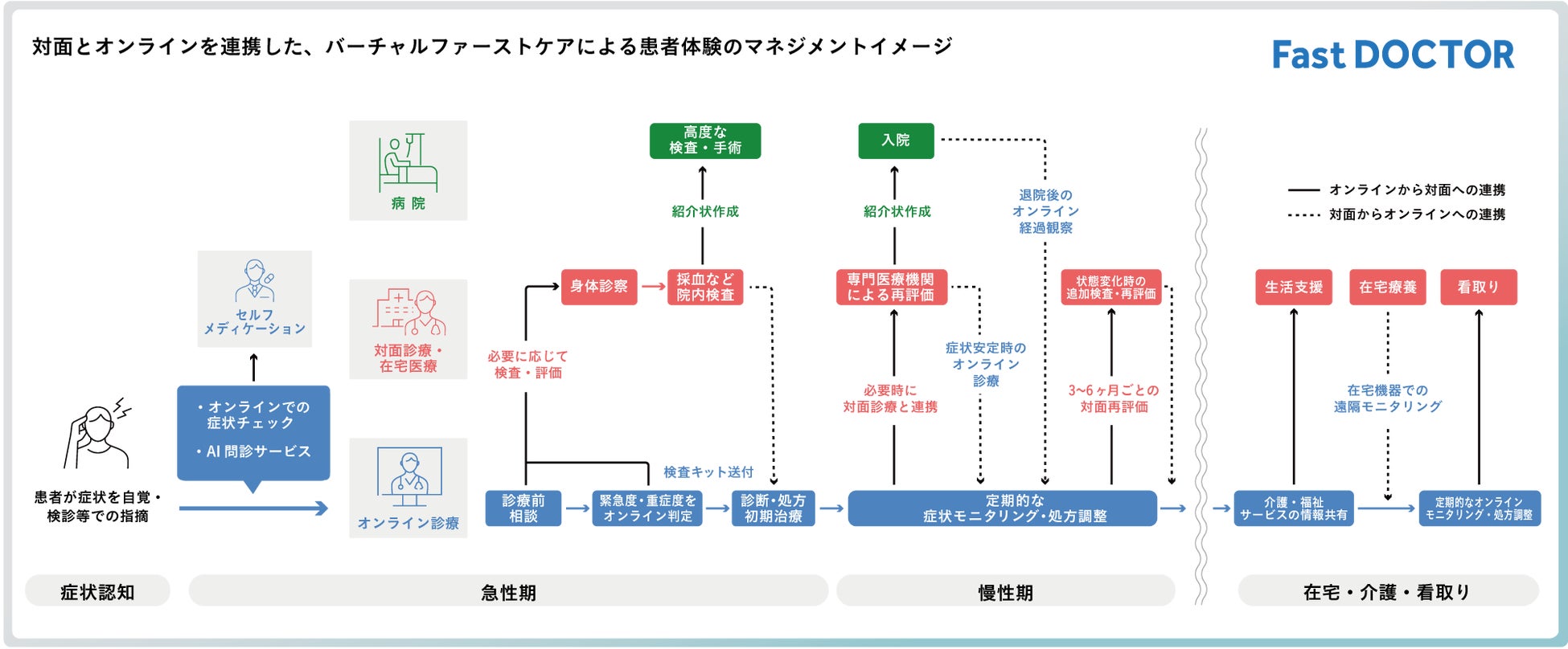当社は、2040年に予想される医療需要のピークを見据え、時間や場所にとらわれない医療アクセスを実現する「バーチャルファーストケア」モデルを提案しています。オンラインでの症状相談やトリアージを初期医療の入口とし、必要に応じて対面診療や各種検査と連携するハイブリッド体制を前提とすることで、限られた医療資源の効率的な運用と、疾患の見落としや重症化防止といった患者の安全性の両立を可能にします。この体制により、患者の状態変化に応じてシームレスに対応し、急性期から慢性期、在宅療養に至るまで切れ目なく患者を支えることが可能になると考えています。