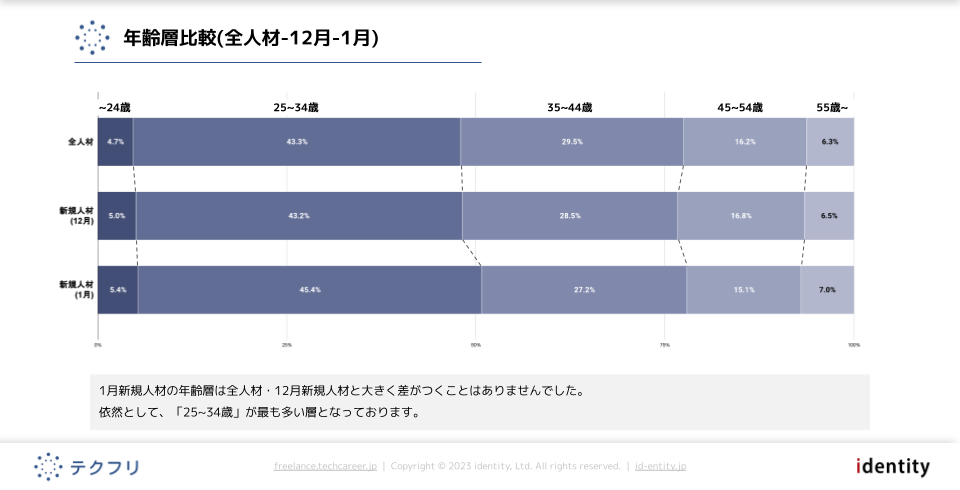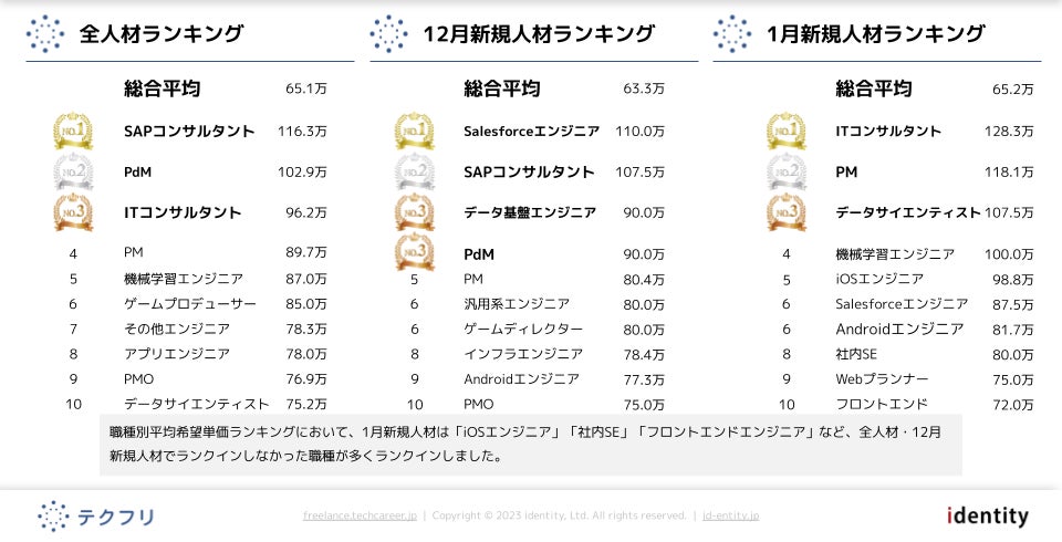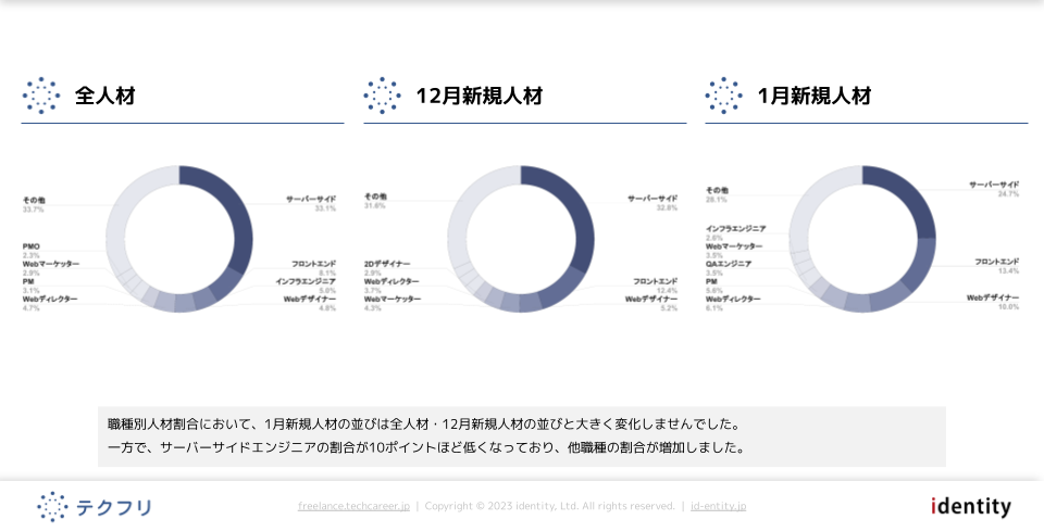 ITフリーランスエンジニアの案件・求人サイト「テクフリ」(https://freelance.techcareer.jp/)を運営する株式会社アイデンティティー(東京都新宿区、代表取締役:今野 力、以下「当社」)は、テクフリのデータベースをもとに2023年1月における人材の市況感を調査しました。より詳しい結果については、お問い合わせから資料請求が可能です。