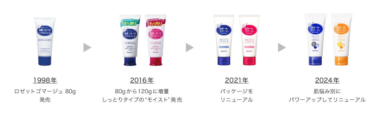 「ロゼットゴマージュ」は、ロゼットが掲げている“肌悩みを解決したい”という想いと、「くすみ」「ザラつき」「ごわつき」といった肌悩みケアへのニーズから、角質ケアに着目して1998年に誕生した『角質ケアジェル』です。発売以来、25年以上にわたるロングセラーブランドとして、いまも多くのお客様に愛され続けています。そんな「ロゼットゴマージュ」が2024年2月、ぬれた肌に使えて、これまでの“角質悩み”だけでなく、「毛穴」「くすみ」それぞれの肌悩みにもアプローチするラインナップへリニューアル。パッケージは親しみのあるイメージはそのままに、店頭でも目に留まるすっきりとシンプルなデザインに仕上げています。