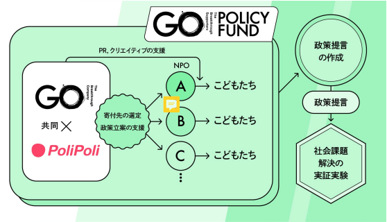 「GO POLICY FUND」は、PoliPoliと、企業のブランディングや事業成⻑⽀援を幅広く⼿掛けてきたGOのアセットを掛け合わせて、こどもの問題解決に取り組むNPO等の⽀援を⾏う新しい形の寄付基⾦です。