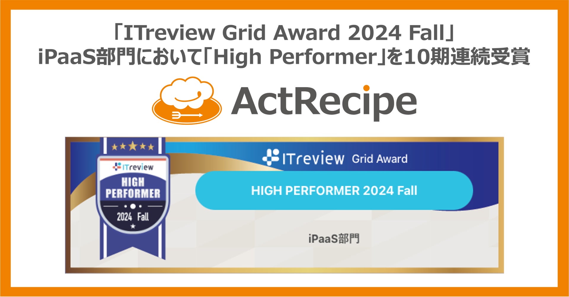 iPaaS「ActRecipe」が「ITreview Grid Award 2024 Fall」において「High Performer」を10期連続受賞