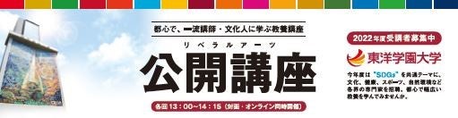 東洋学園大学(学校法人東洋学園 本部:文京区本郷 理事長:愛知太郎)では、2022年度東洋学園公開講座(リベラルアーツ)を対面講座(本郷キャンパス内)とオンライン講座(Zoomウェビナー)のハイブリッド形式で開催いたします。