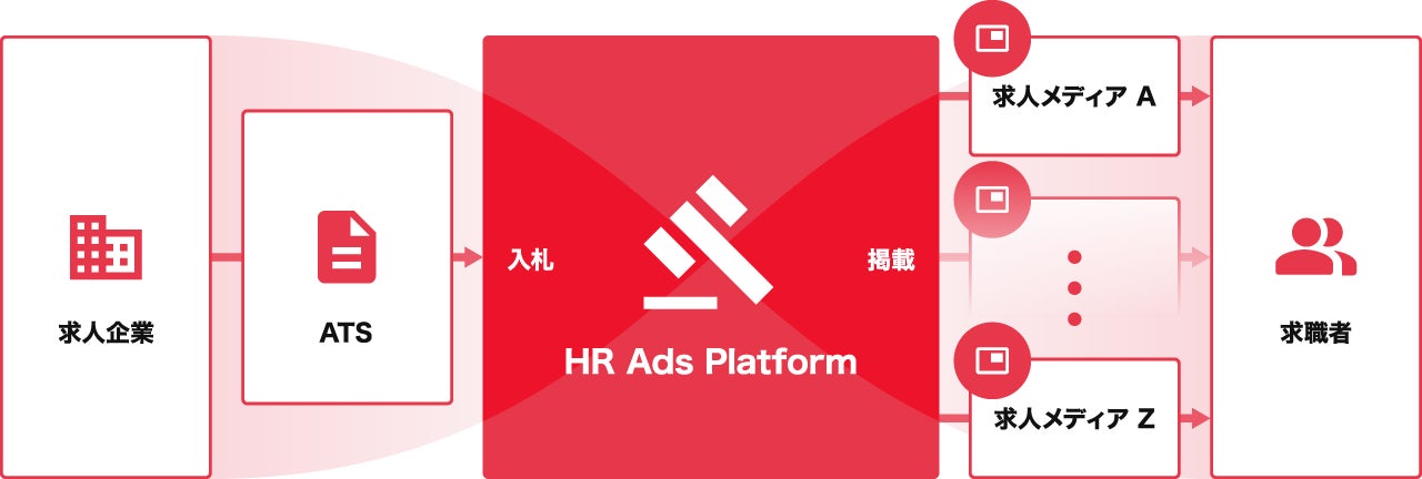 「HRアドプラットフォーム」は、『運用型広告』と呼ばれるWEB広告手法を活用した運用型求人広告プラットフォームです。求人企業が求人広告を入札すると、「HRアドプラットフォーム」と提携している複数の求人メディアに求人広告が自動掲載され、簡単かつ即時性の高い求人広告運用を可能にします。
