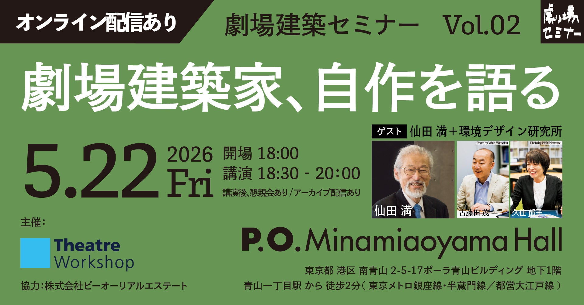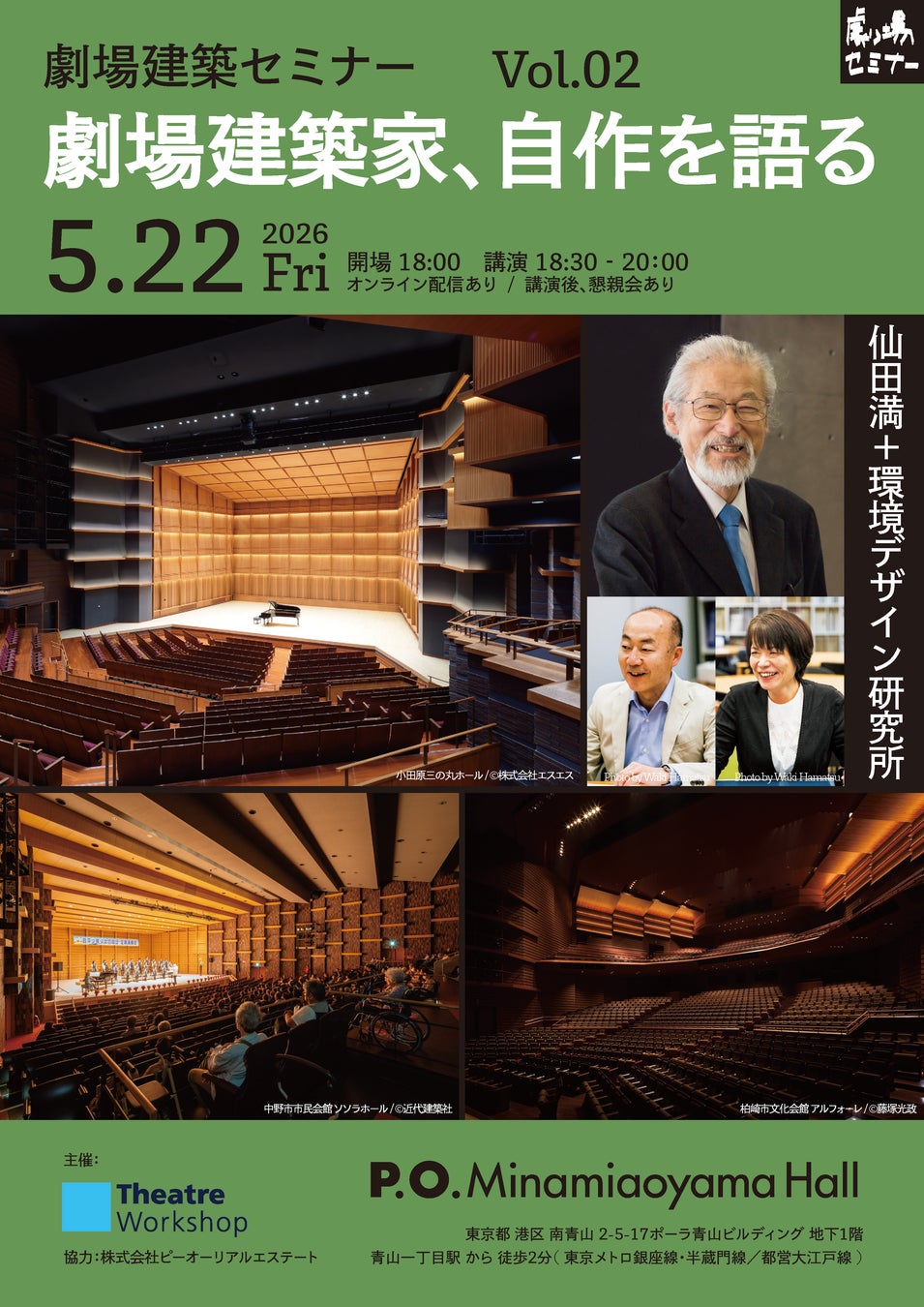 Vol.02は、2026年5月22日(金)にP.O.南青山ホール(東京都港区)にて、株式会社環境デザイン研究所の会長・仙田満氏、ゼネラルマネージャー・古藤田茂氏、ゼネラルマネージャー・久住郁子氏をお迎えし、これまで設計された小田原三の丸ホールなどをはじめとした劇場建築作品について実例を紐解きながら、現代の劇場建築の担う役割や未来を、参加者のみなさんと共に考えます。