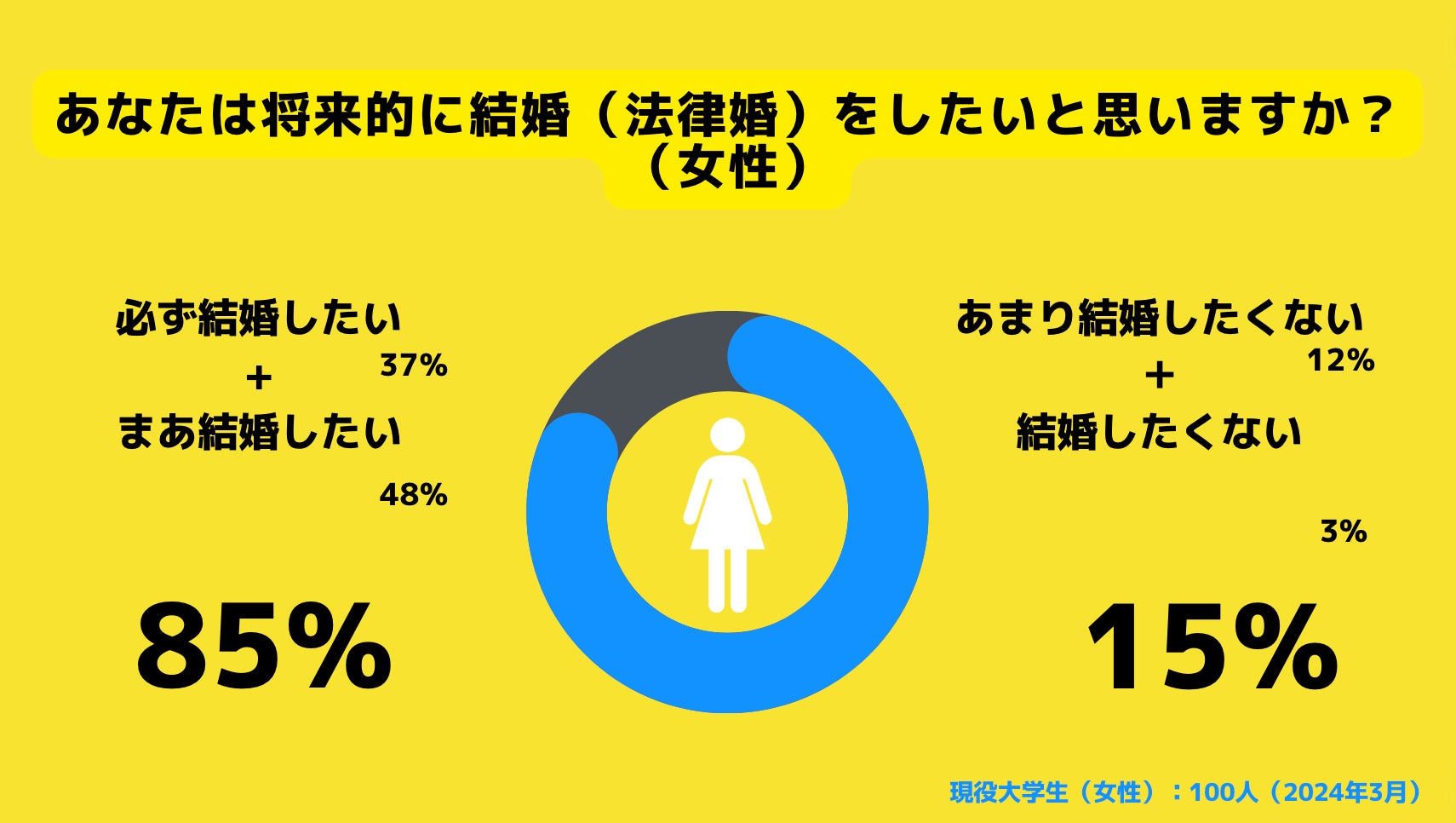 女子大学生は85%、男子大学生も91%が「結婚したい」と回答しました。