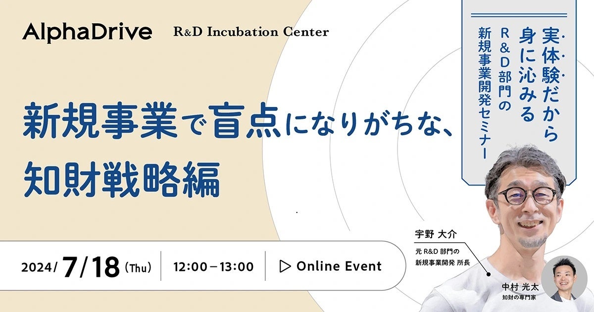 AlphaDriveのR&D Incubation Center主催にてお送りする研究開発部門のための事業開発セミナーで、実務経験をもとに、新規事業開発における知財戦略の要点をまとめてお話しします。