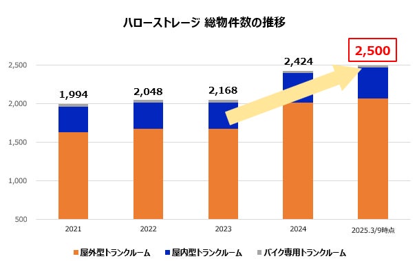 日本最大級のレンタルトランクルーム「ハローストレージ」を運営するエリアリンク株式会社(本社:東京都千代田区、代表取締役:鈴木貴佳、以下「エリアリンク」)は、2025年3月9日(日)に屋外型トランクルーム「ハローストレージ半田花園町」(愛知県半田市)および屋内型トランクルーム「ハローストレージ若林遠見塚2」(宮城県仙台市)を新規出店いたしました。これにより、ハローストレージの物件数は2,500件を突破したことをお知らせいたします。
