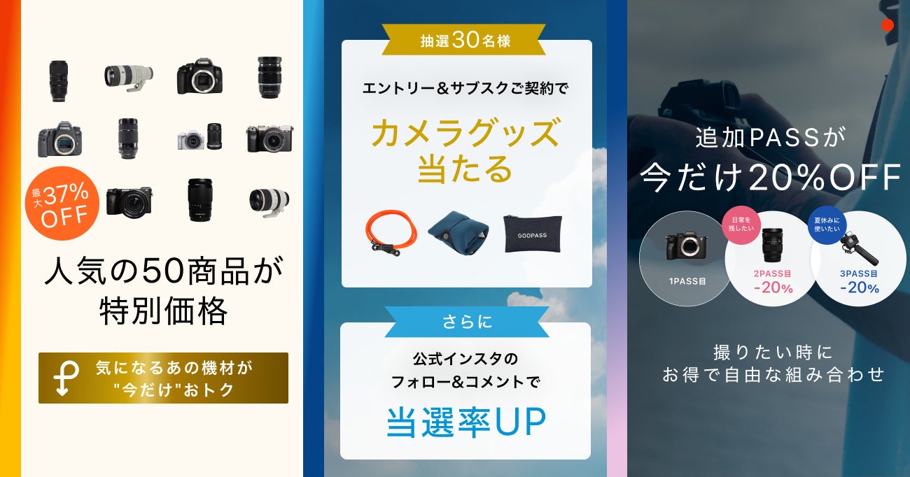 7月は人気の50商品を対象にした特別プライスダウンキャンペーンや、カメラグッズが当たるプレゼントキャンペーン、さらに複数の機材を同時にお得に試せるプランなど、GOOPASSをより楽しんでいただけるラインナップを多数ご用意。月に一度のお得なチャンスをお見逃しなく。