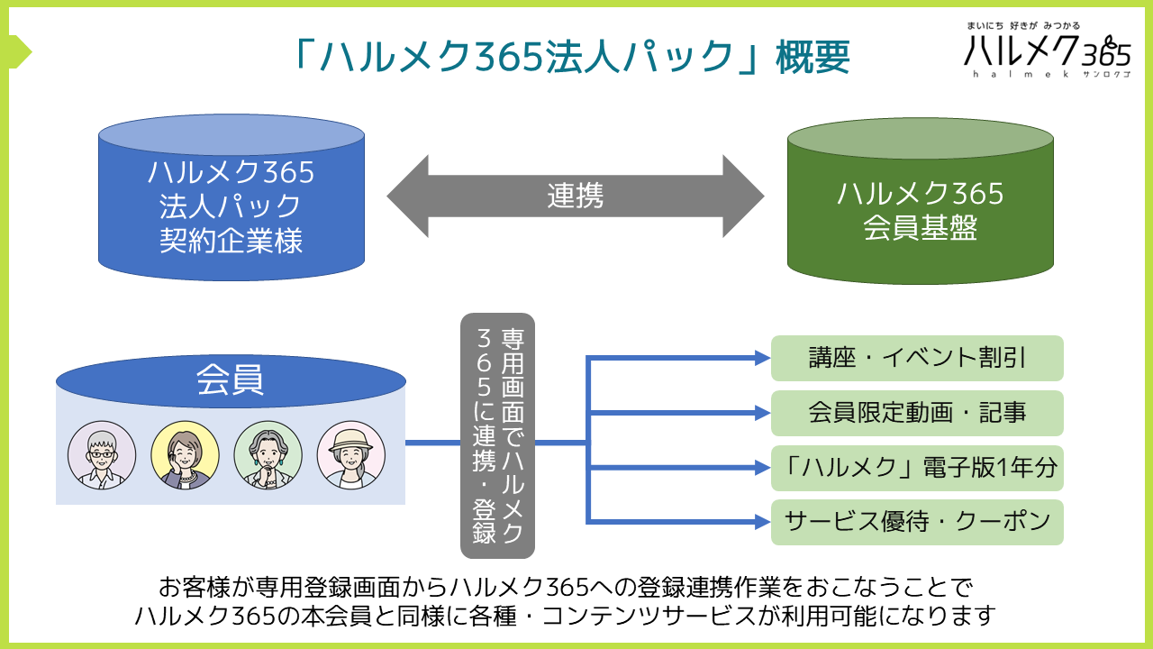 なおハルメクでは今回の導入を機に、「ハルメク365法人パック」を法人会員向けの福利厚生サービスとして提供してまいります。