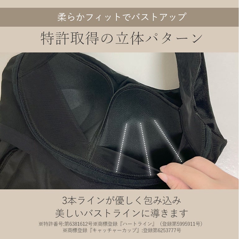 3本ラインの入ったフィット感の良いキャッチャーカップと「引き上げループ」でバストをしっかり持ち上げ、ノンワイヤーでも立体的な丸みのある美しいバストラインを実現します。(特許取得:6381612号)