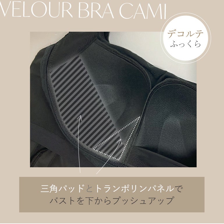 上質なヴィンテージ感と華やかさのあるベロア生地は、昨今のレトロブームによって人気の素材です。美シルエットをかなえる「ベロアブラキャミ」は、特許取得のパターンを採用した補整ブラトップです。ノンワイヤーで快適な着用感でありながら、立体的な丸みのある美しいバストシルエットを実現。また、前身頃に入った切り替えラインによって、胴回りをスタイリッシュに見せる効果も。シンプルなデザインで、インナーとしてはもちろん、シャツやジャケットを羽織るだけで、コーディネートが完成します。
