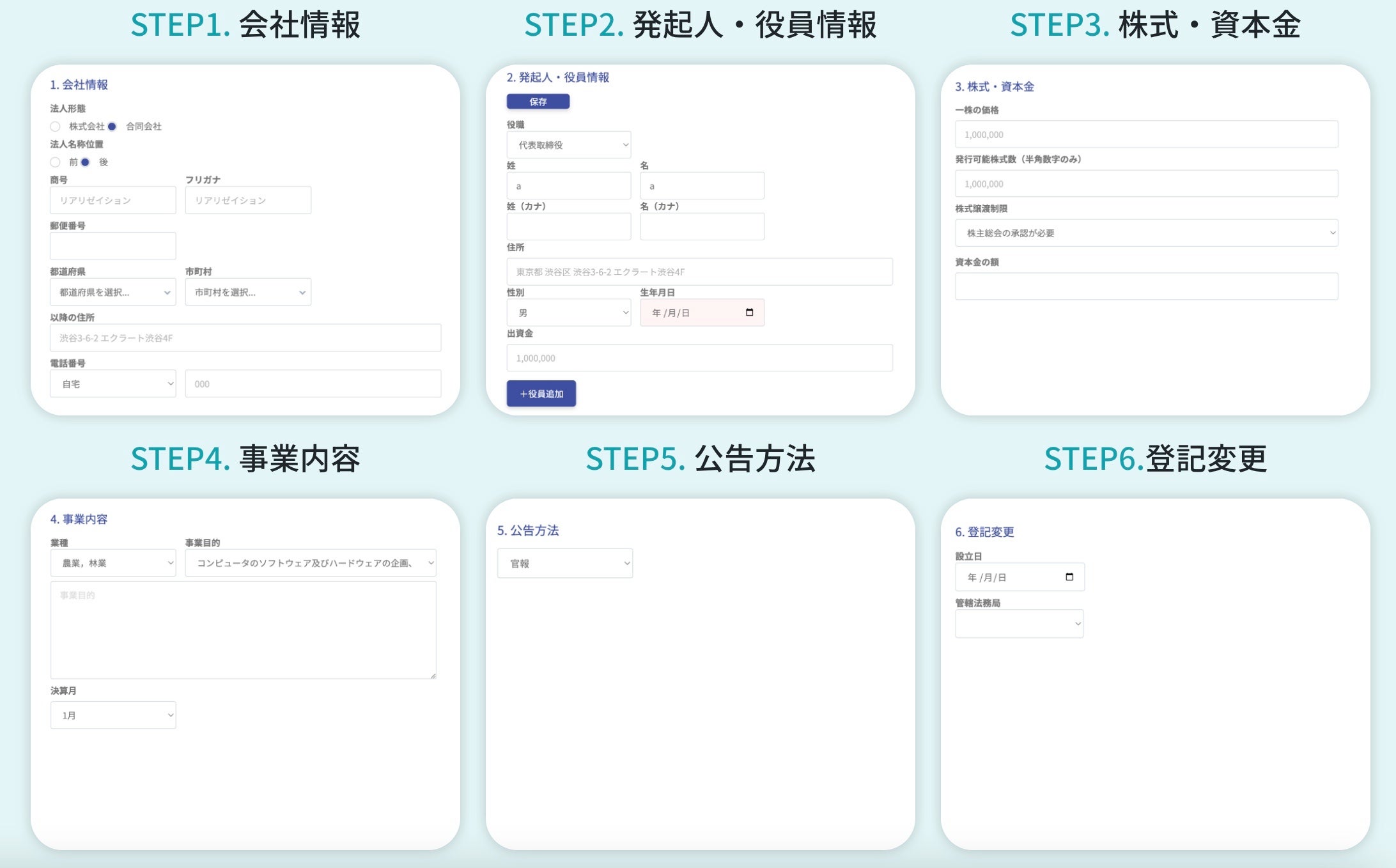 6つのステップに沿って入力するだけですので、最短5分で法人登記書類が完成します。