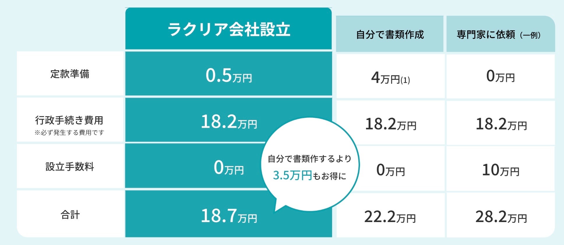 - 「ラクリア会社設立」なら自分で書類作成するより3.5万円もお得に!
