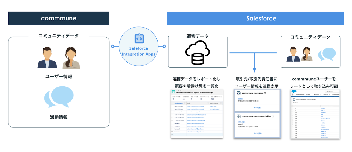 commmune上で運営しているコミュニティのデータをSalesforceに取り込み、同期させることができるアプリです。連携されたデータはダッシュボードやレポート機能で扱うことができるため、レポートをもとに顧客への適切なアクションを実行していくことが可能となります。