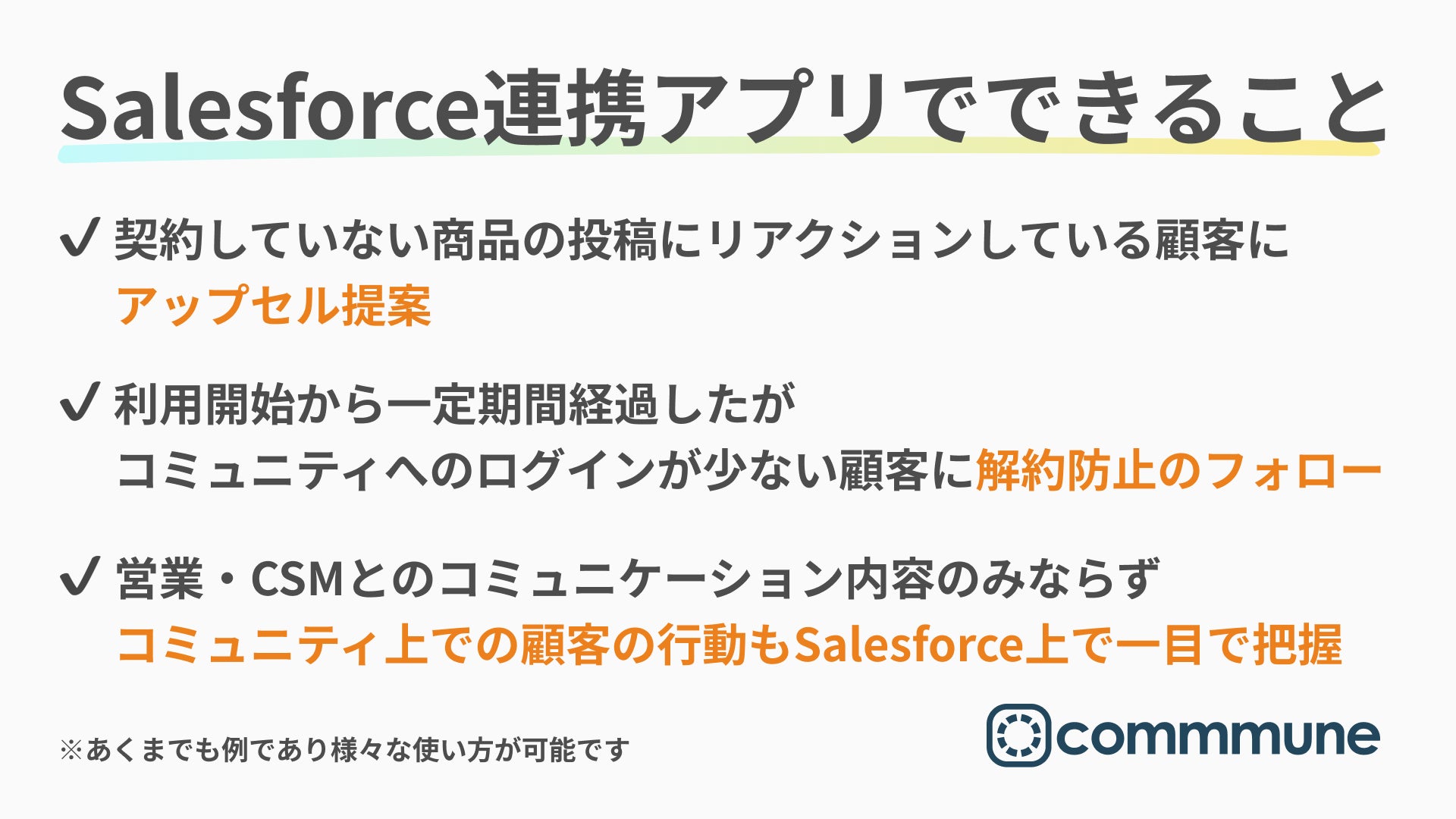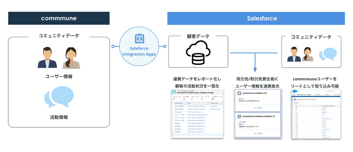 企業とユーザーが融け合うコミュニティサクセスプラットフォーム「commmune(コミューン)」と、効率的なカスタマーサクセスのためのアクション基盤「SuccessHub(サクセスハブ)」を提供するコミューン株式会社(本社:東京都品川区、代表取締役CEO:高田優哉)は、Salesforce連携アプリをリリースしたことをお知らせいたします。本アプリにより、コミュニティ内でのお客様の活動をSalesforce上で把握することが可能となり、お客様に対するより良いコミュニケーションと、それによる事業貢献を強力に支援・推進します。